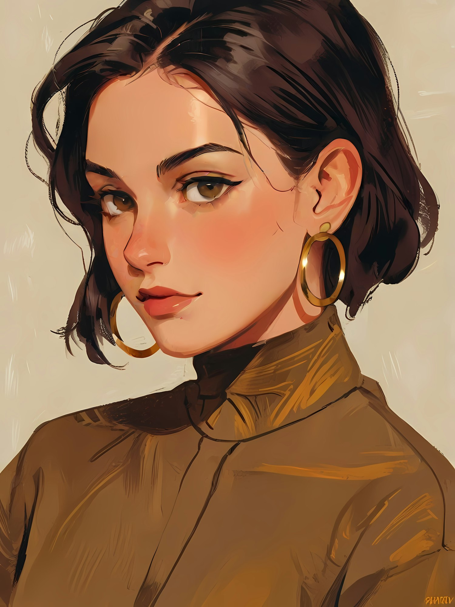 An illustration of a woman with short dark hair, wearing large hoop earrings and a brown top, displaying a modern and elegant style.