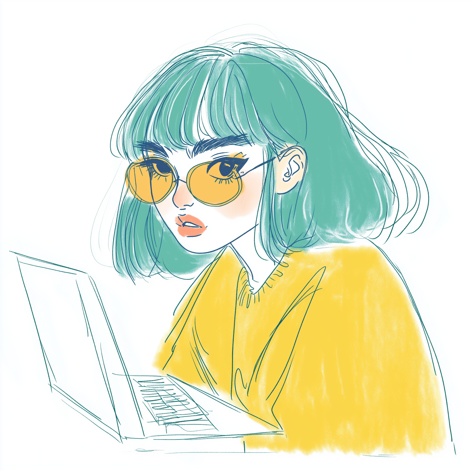 Stylized illustration of a woman with teal hair and yellow sunglasses, wearing a yellow sweater, focused on a laptop.
