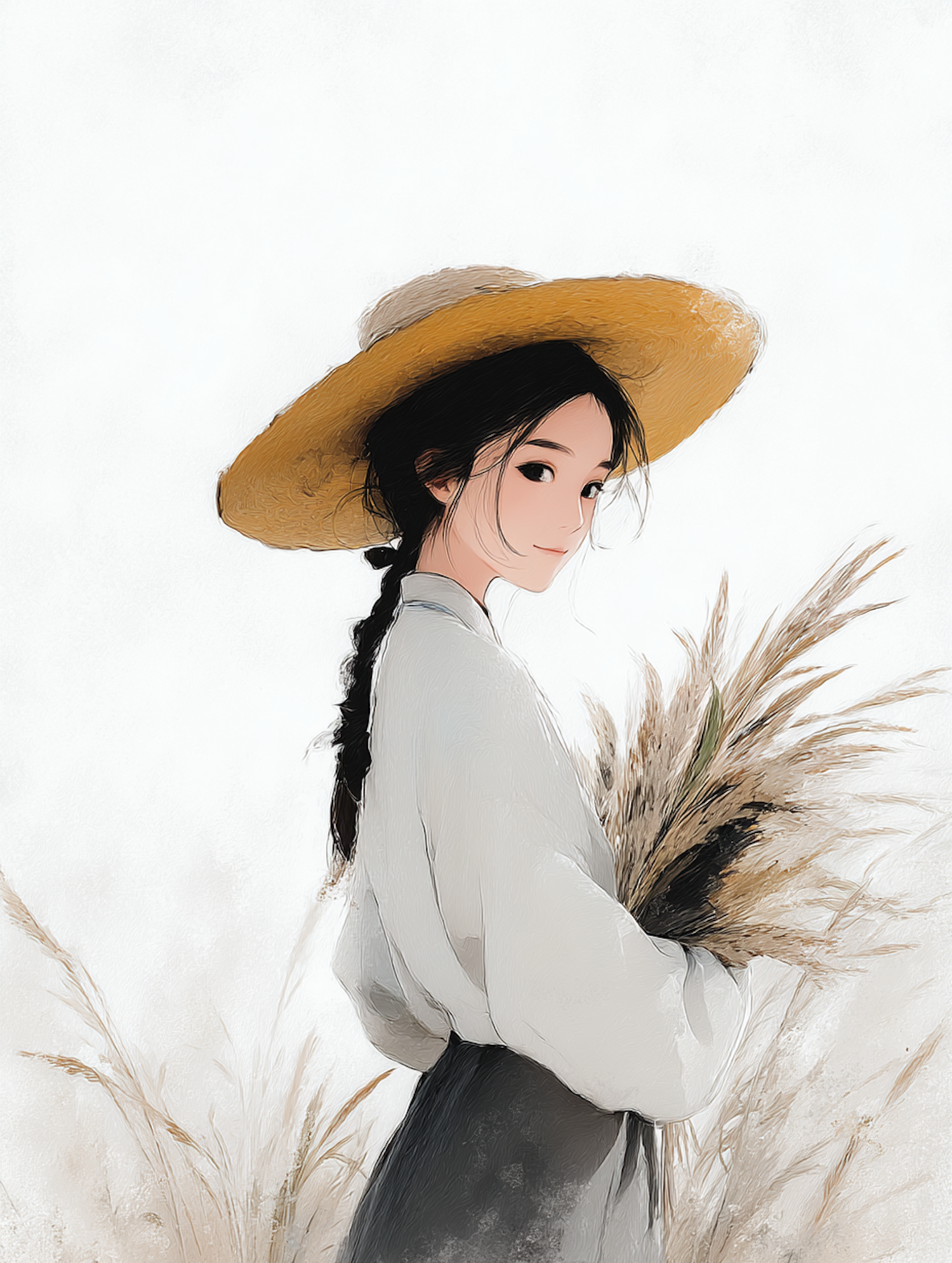 Digital art portraying a woman in a straw hat holding wheat, capturing a soft pastoral vibe with warm tones and light textures.