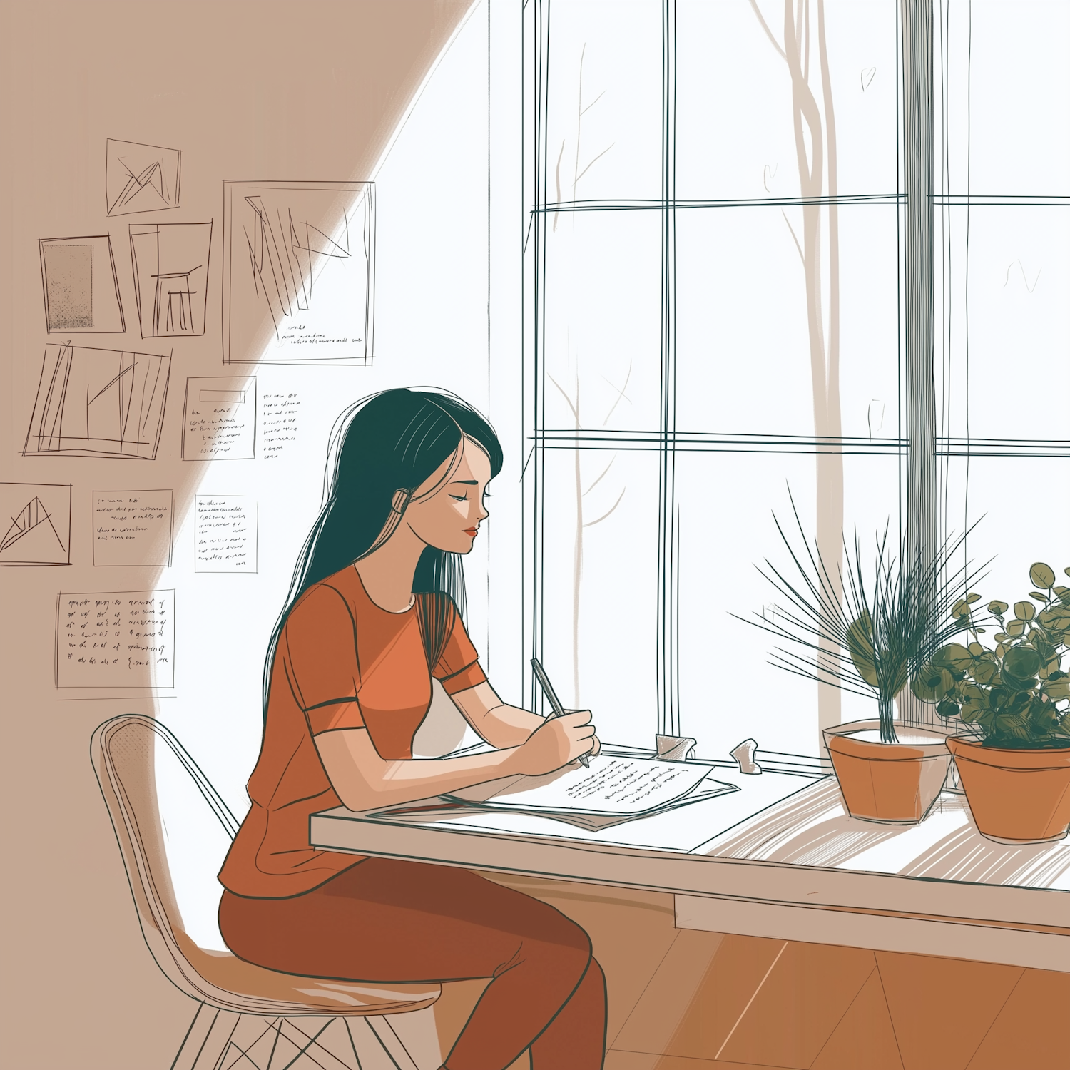 Illustration of a woman writing at a desk by a window, surrounded by sketches and plants, in a serene, sunlit room.