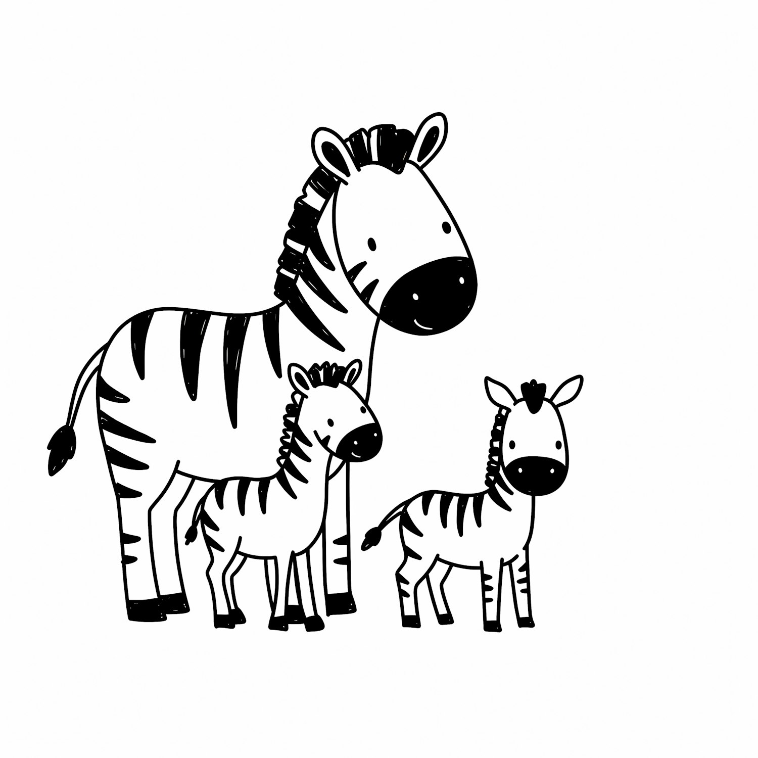 A cute black-and-white cartoon illustration of a zebra family, featuring a parent and two young zebras with bold stripes on a white background.