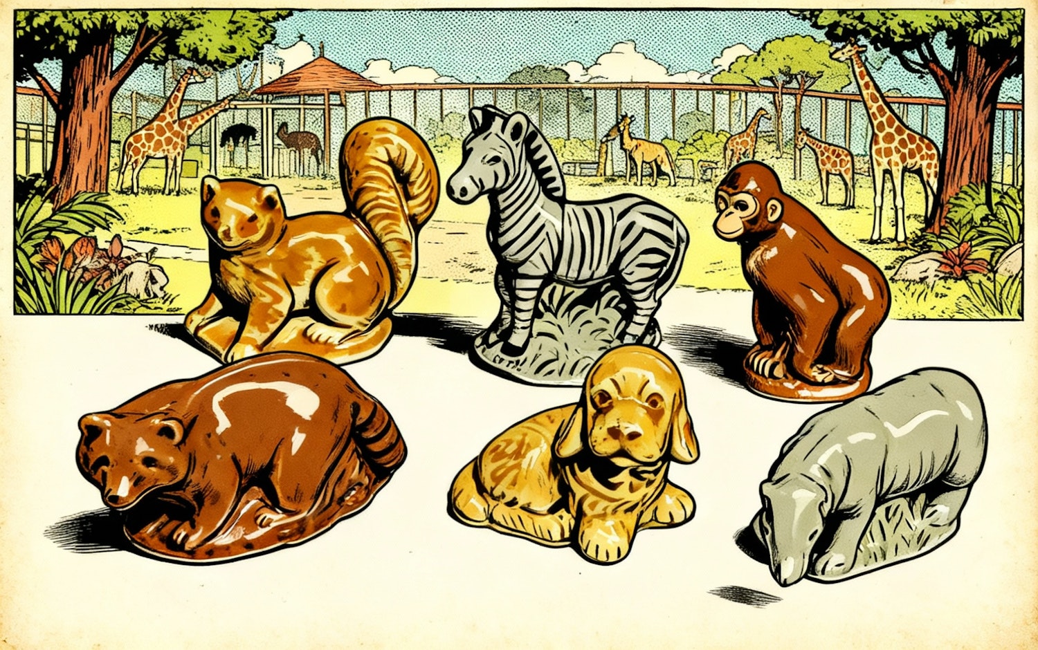 Illustration of ceramic animal figurines in a zoo setting with giraffes and trees in the background, showcasing a playful and colorful scene.