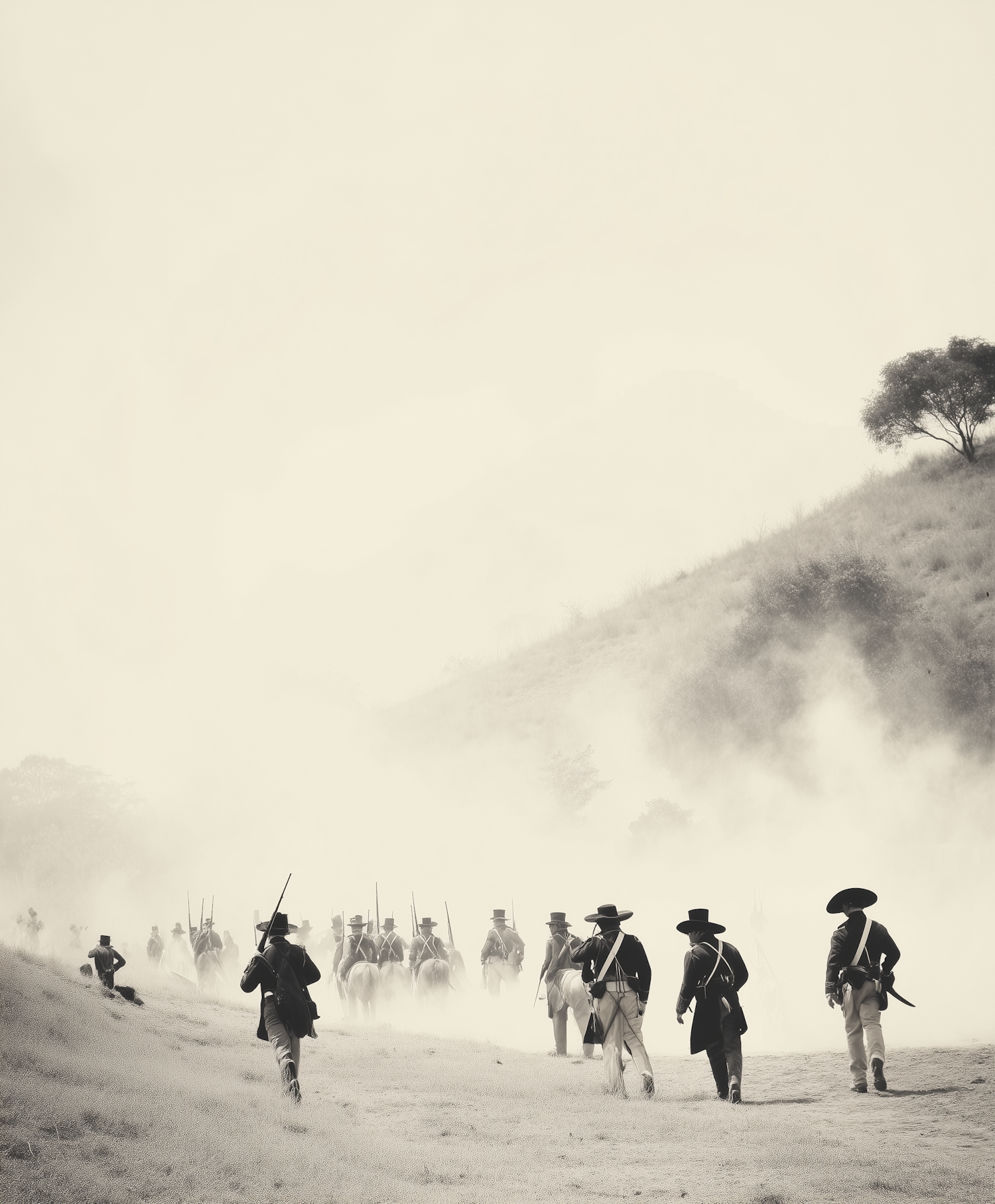 Sepia-toned image of 19th-century soldiers marching through a misty, grassy landscape, evoking a dramatic historical atmosphere.