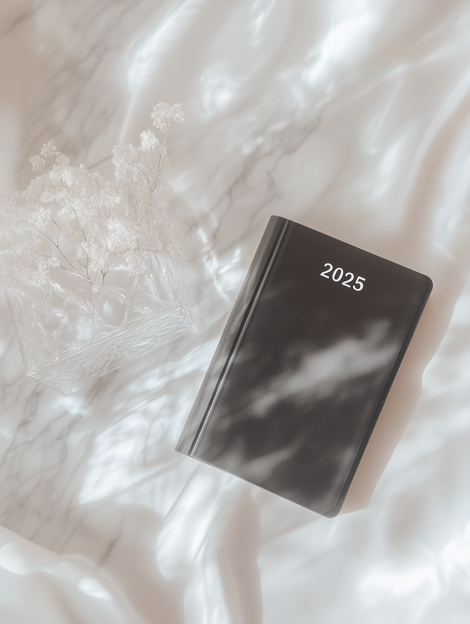 Elegant 2025 planner on white satin with delicate flowers in a glass vase, set against a marble background.