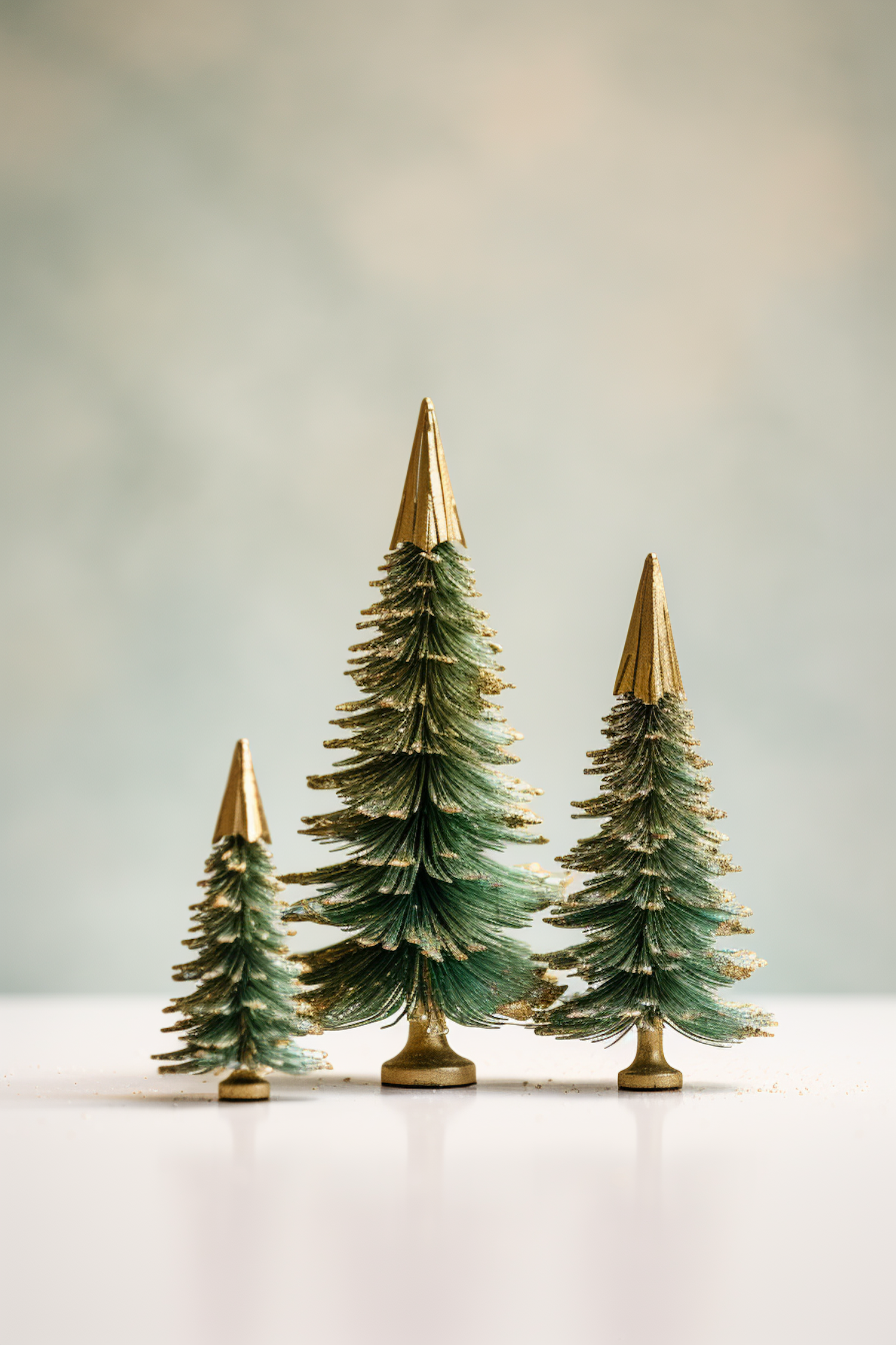 Three miniature Christmas trees with golden tips and glittery branches on a white surface, set against a soft green background.