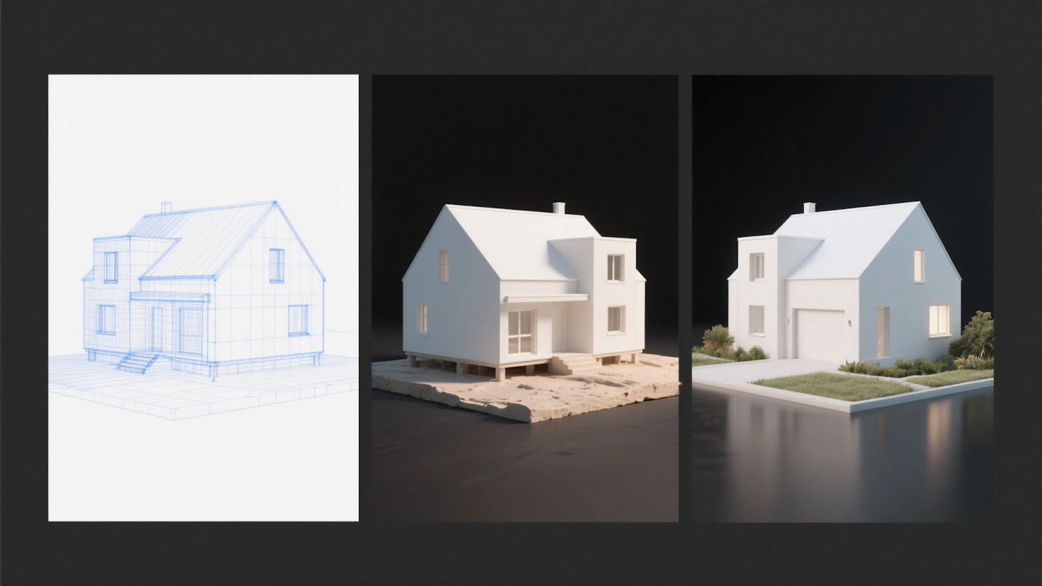 A minimalistic white house with clean lines and elegant modern architecture. The image is divided into three vertical sections: the left section shows a blue wireframe architectural sketch of the house on a white background; the middle section shows the house in a clay model stage with visible foundations and simple 3D structure; the right section shows the final photorealistic render with full textures, lighting, and landscaping. All three sections align perfectly to form the same house in different stages of development. Clean studio lighting, white background, high detail. black solid background