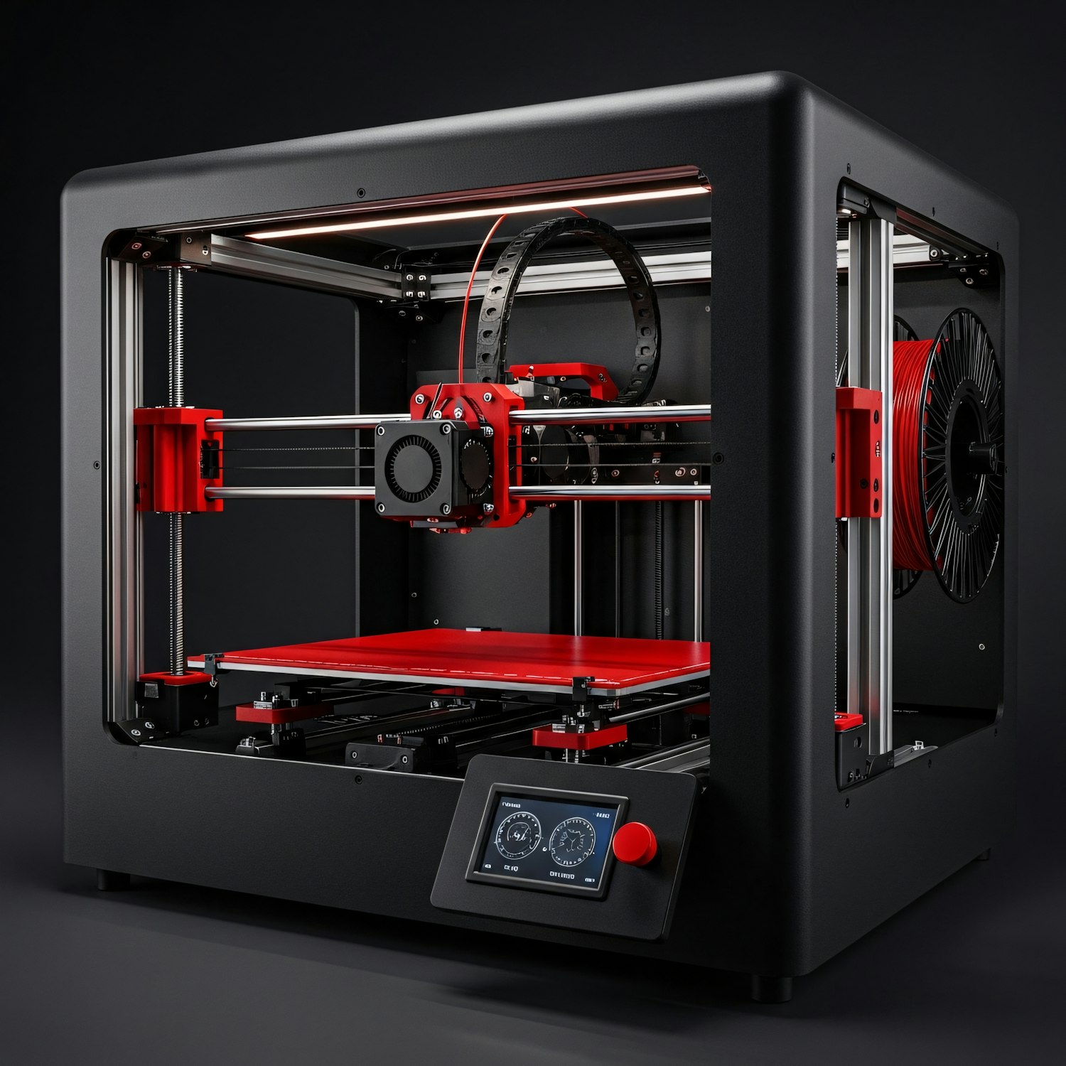 Sleek black and red 3D printer with a sturdy frame, touchscreen interface, and side-mounted filament spool for precision printing.