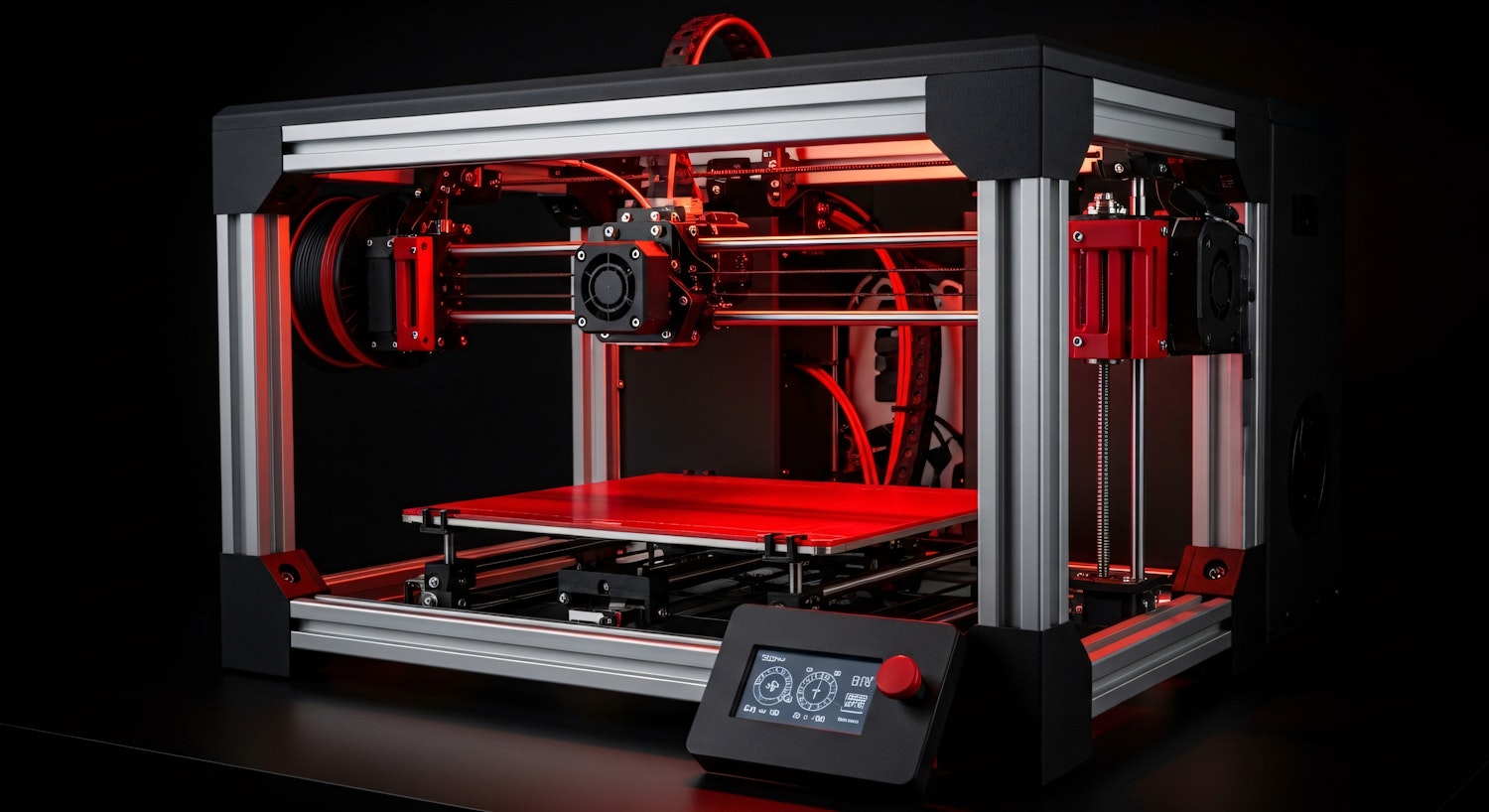Sleek 3D printer with red lighting, aluminum frame, and digital control panel, perfect for precision printing projects.