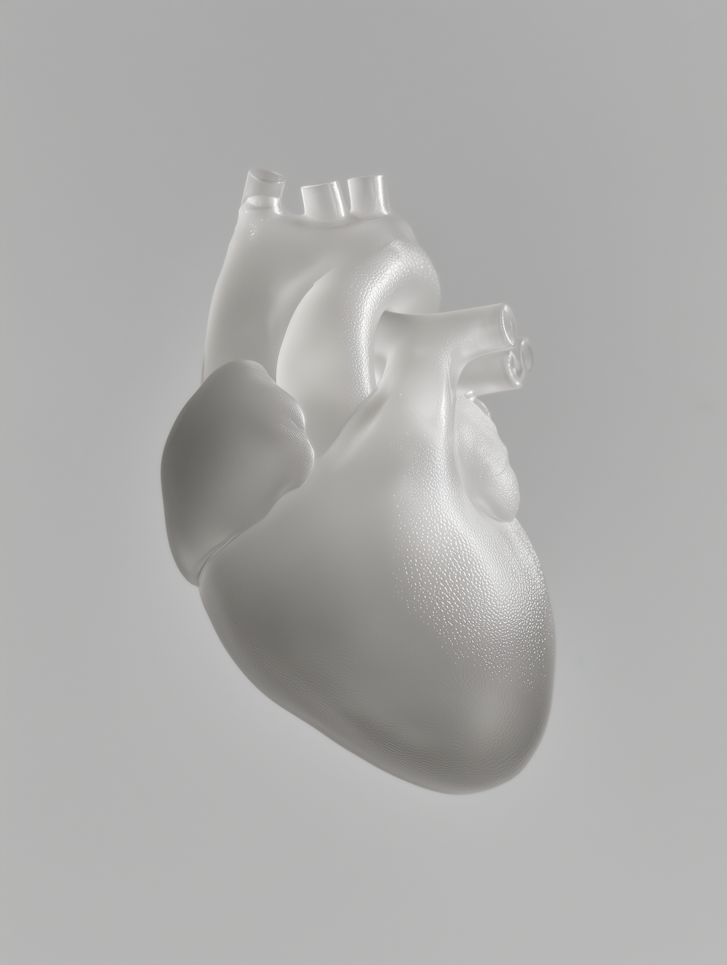 A detailed 3D rendering of a human heart in white, showcasing its anatomical structure against a neutral gray background.