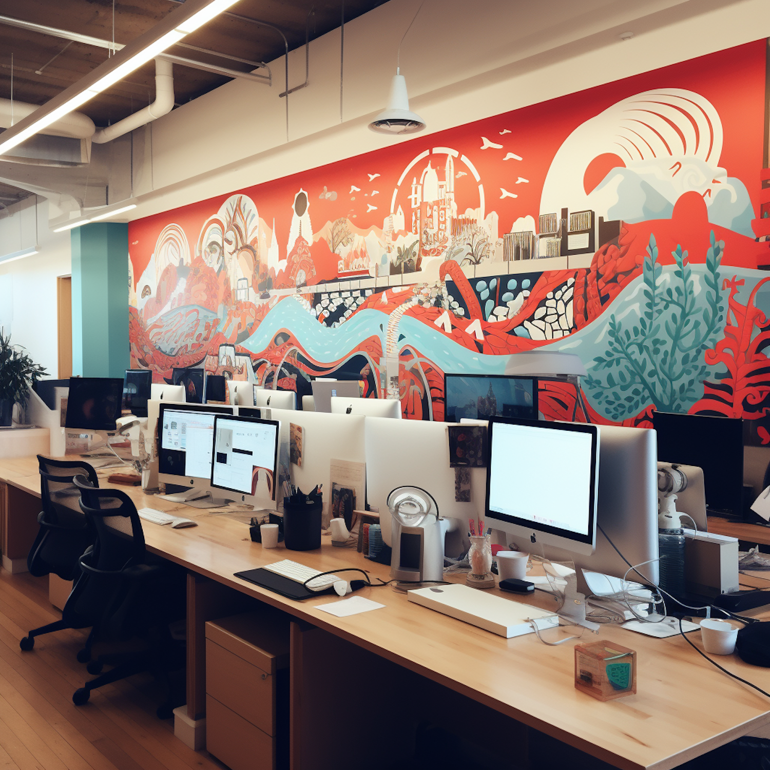 Modern office with sleek computers, vibrant mural, and industrial ceiling. Creative and organized workspace with a warm atmosphere.