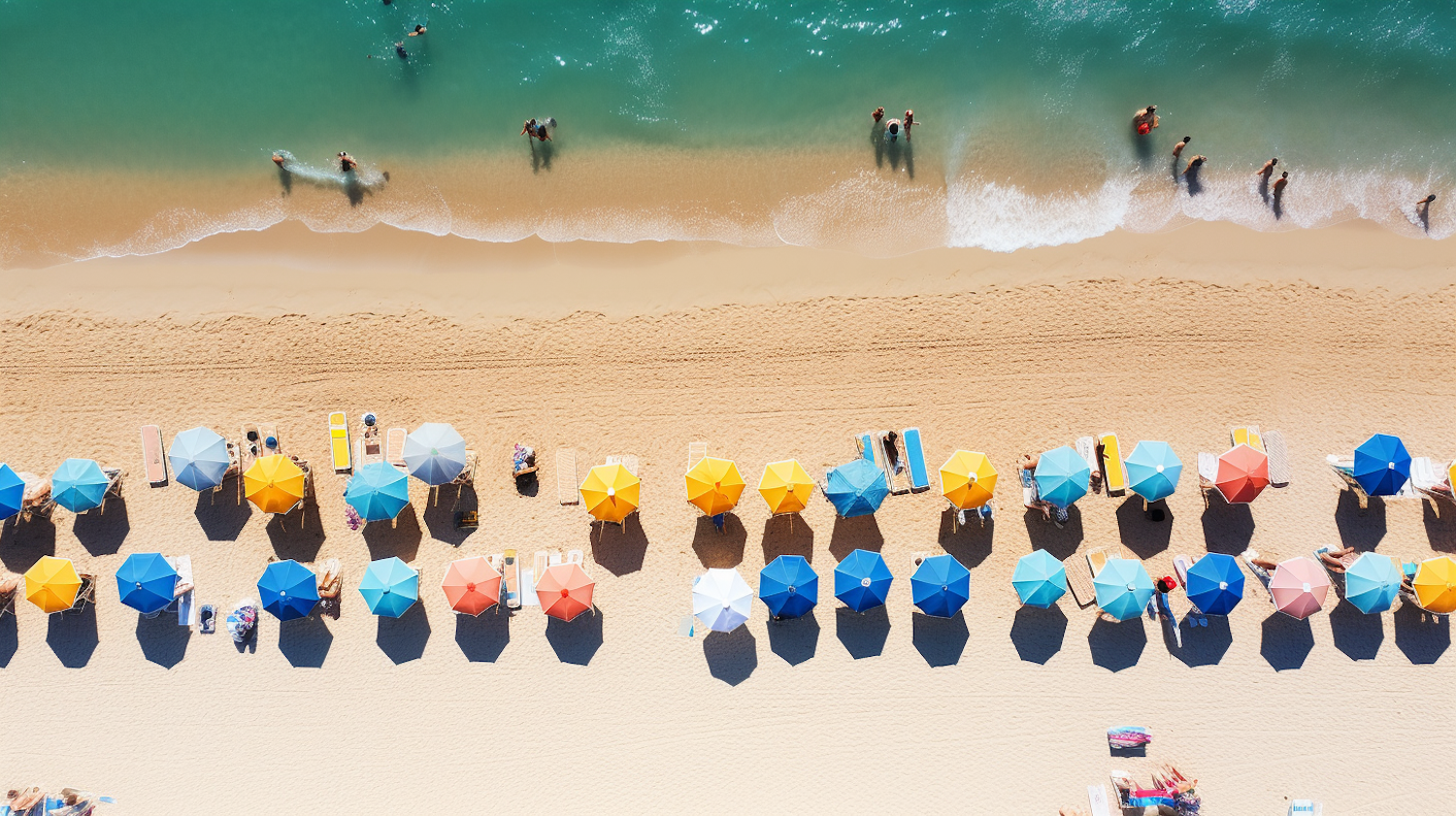 Aerial view of a beach with colorful umbrellas, sunbathers, and turquoise waves. Vibrant summer scene with golden sand and ocean.
