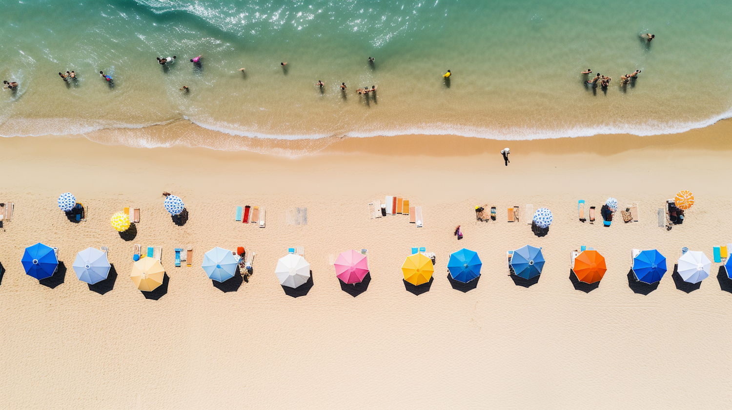 Aerial view of a colorful beach with umbrellas and people enjoying the sun and sea. Vibrant summer scene with turquoise water.