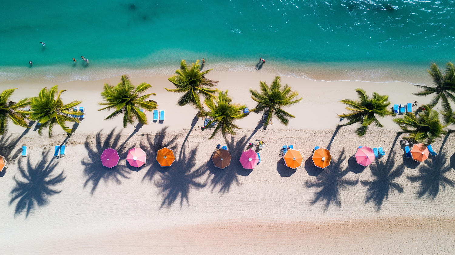 Aerial view of a tropical beach with colorful umbrellas, palm trees, and turquoise water, creating a serene and vibrant vacation scene.