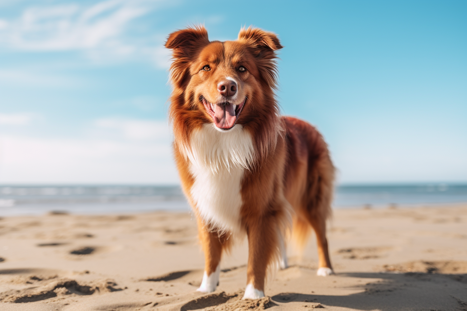 Joyful brown and white dog on a sunny beach, with ocean waves in the background and a clear blue sky overhead.