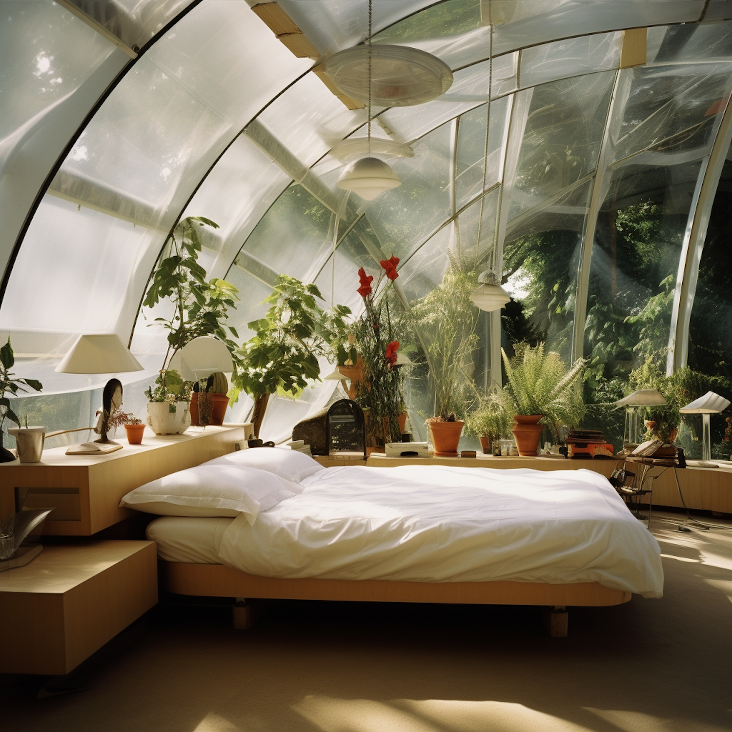 Modern bedroom with transparent ceiling, lush plants, and elegant decor, creating a serene and natural ambiance.