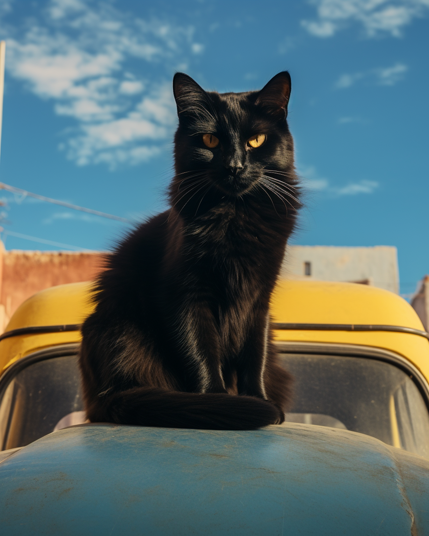 A black cat with yellow eyes sits on a vintage blue and yellow car under a clear blue sky, creating a whimsical and nostalgic scene.