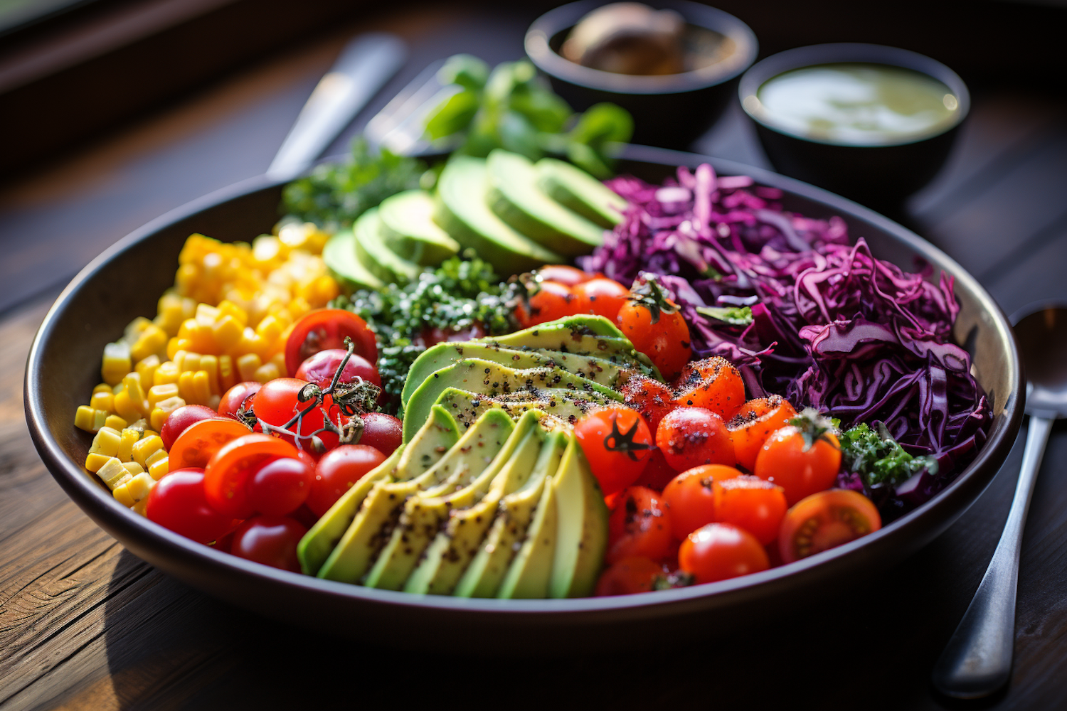 Colorful salad bowl with avocado, cherry tomatoes, corn, and purple cabbage on a wooden table.