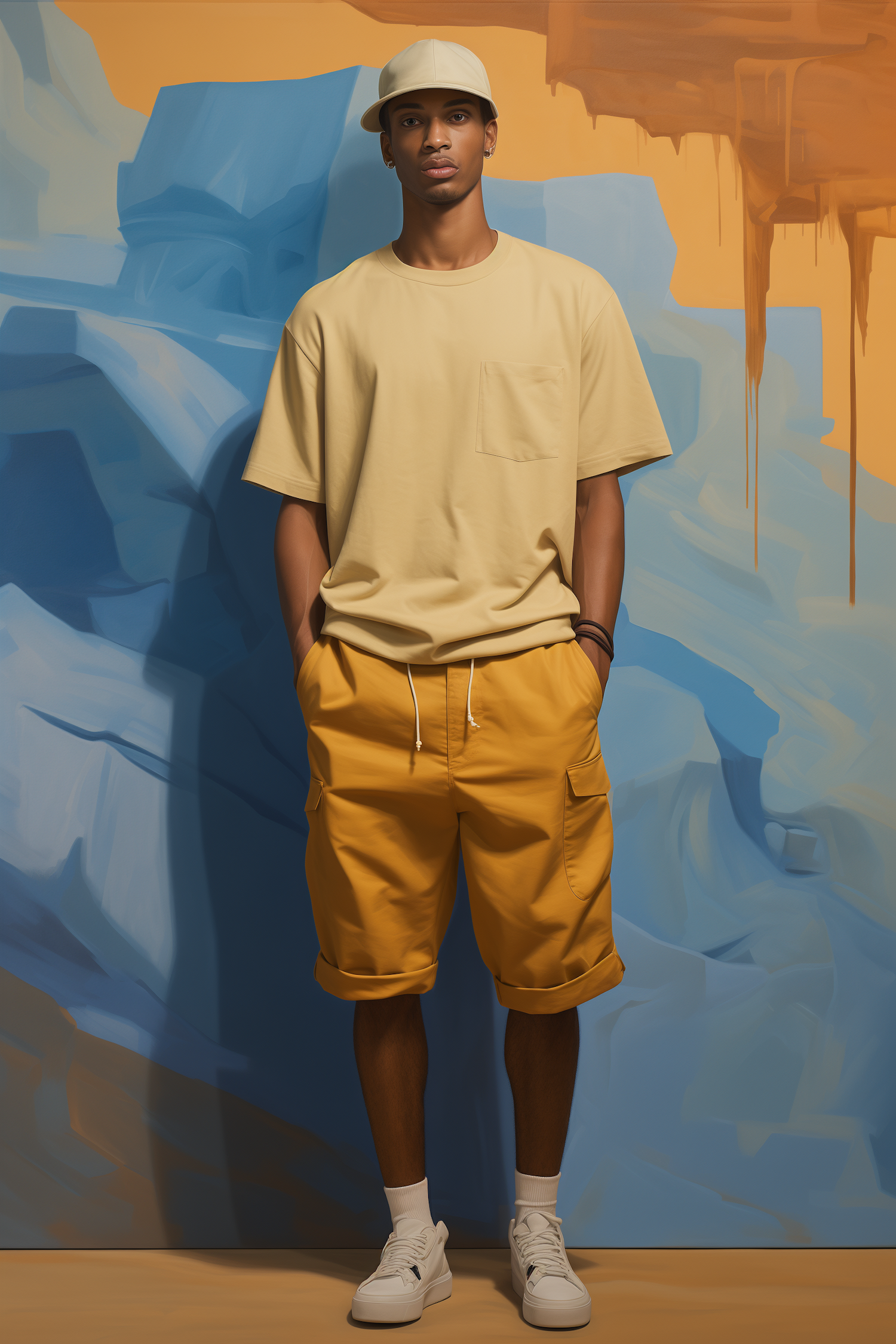 Stylish young man in beige and mustard outfit against a vibrant abstract background of blue and orange hues.