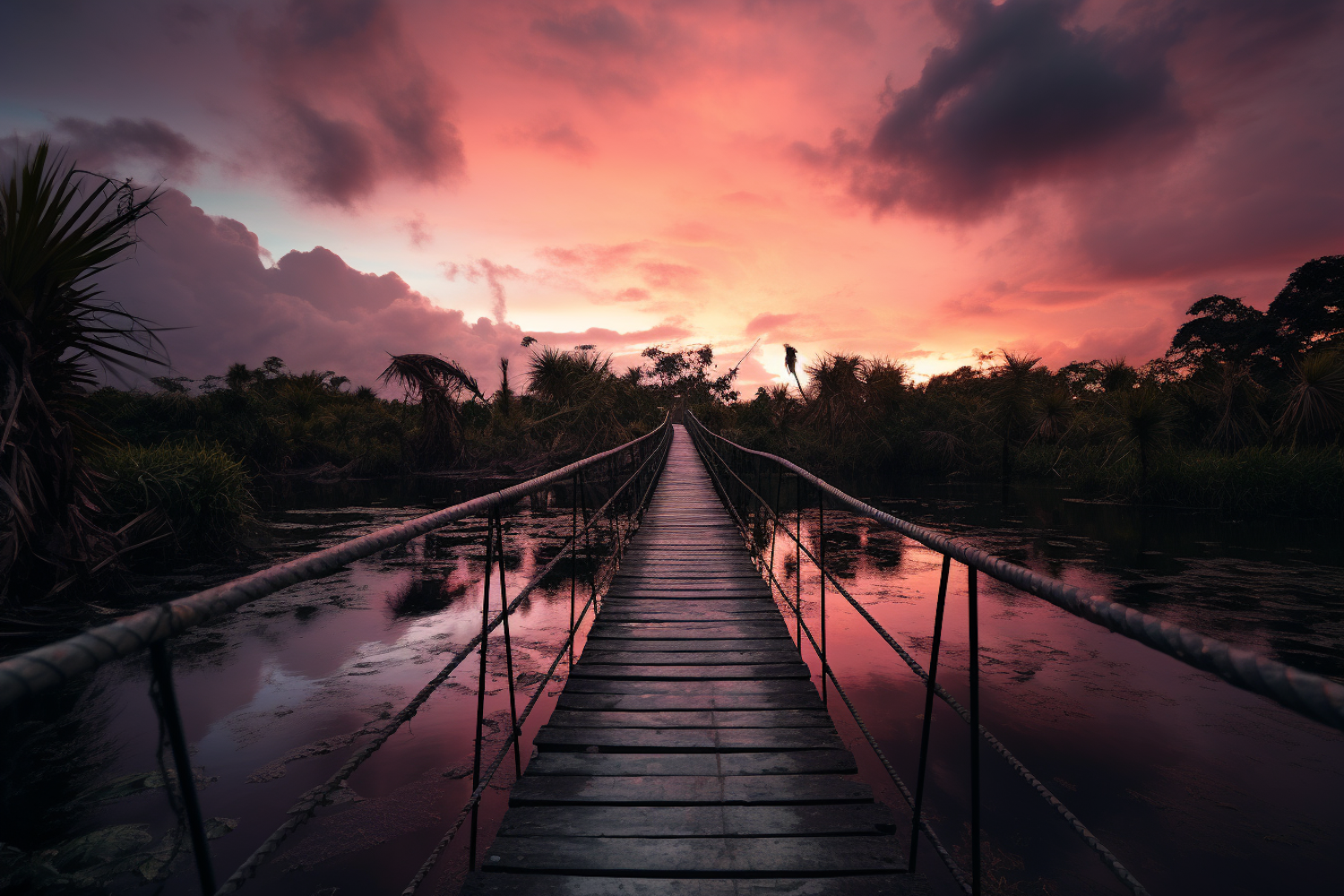 A narrow wooden bridge leads into a lush forest under a vibrant pink and orange sky, reflecting in the calm water below.