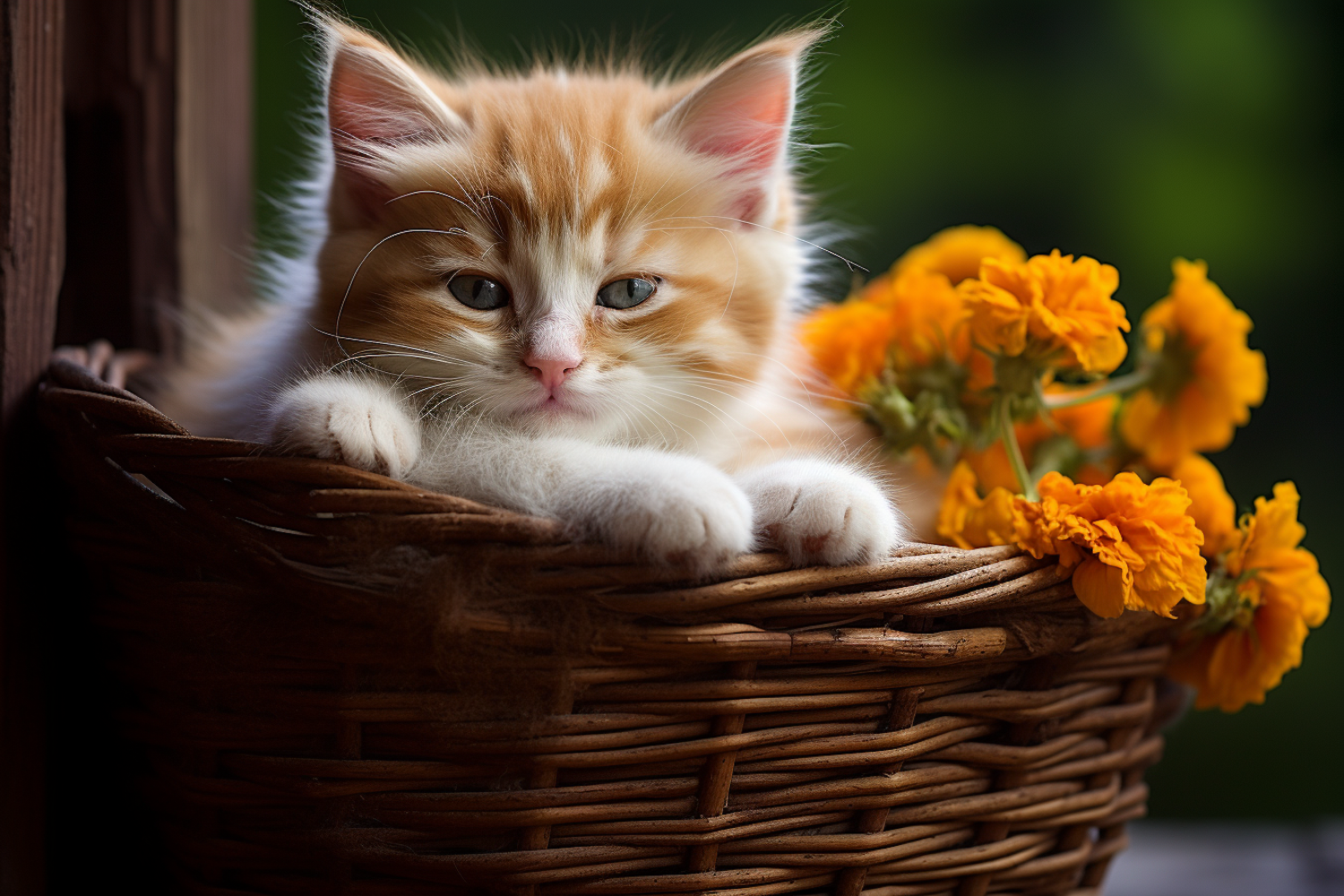 Adorable orange and white kitten in a wicker basket with vibrant marigold flowers, set against a blurred green background.