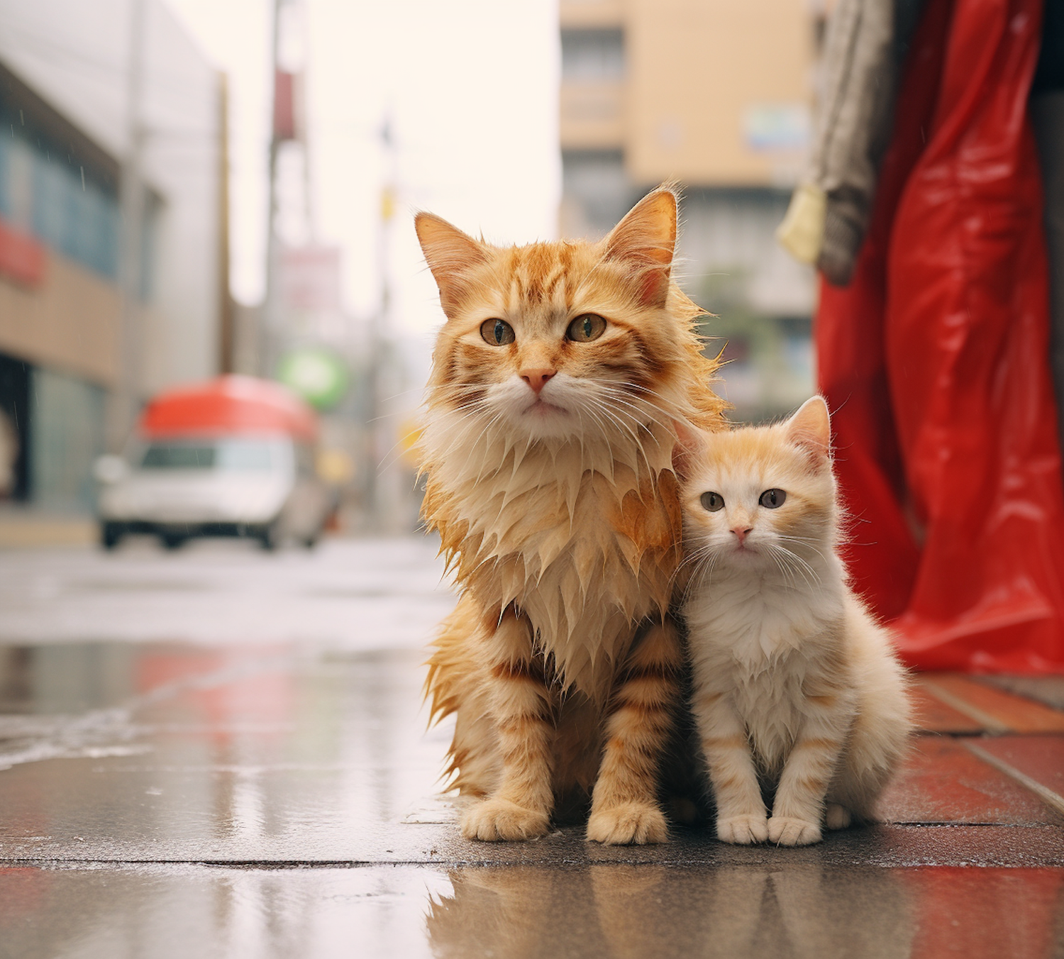 Ginger cat and kitten sitting on a wet sidewalk, their fur damp from rain, in an urban street setting with blurred background.
