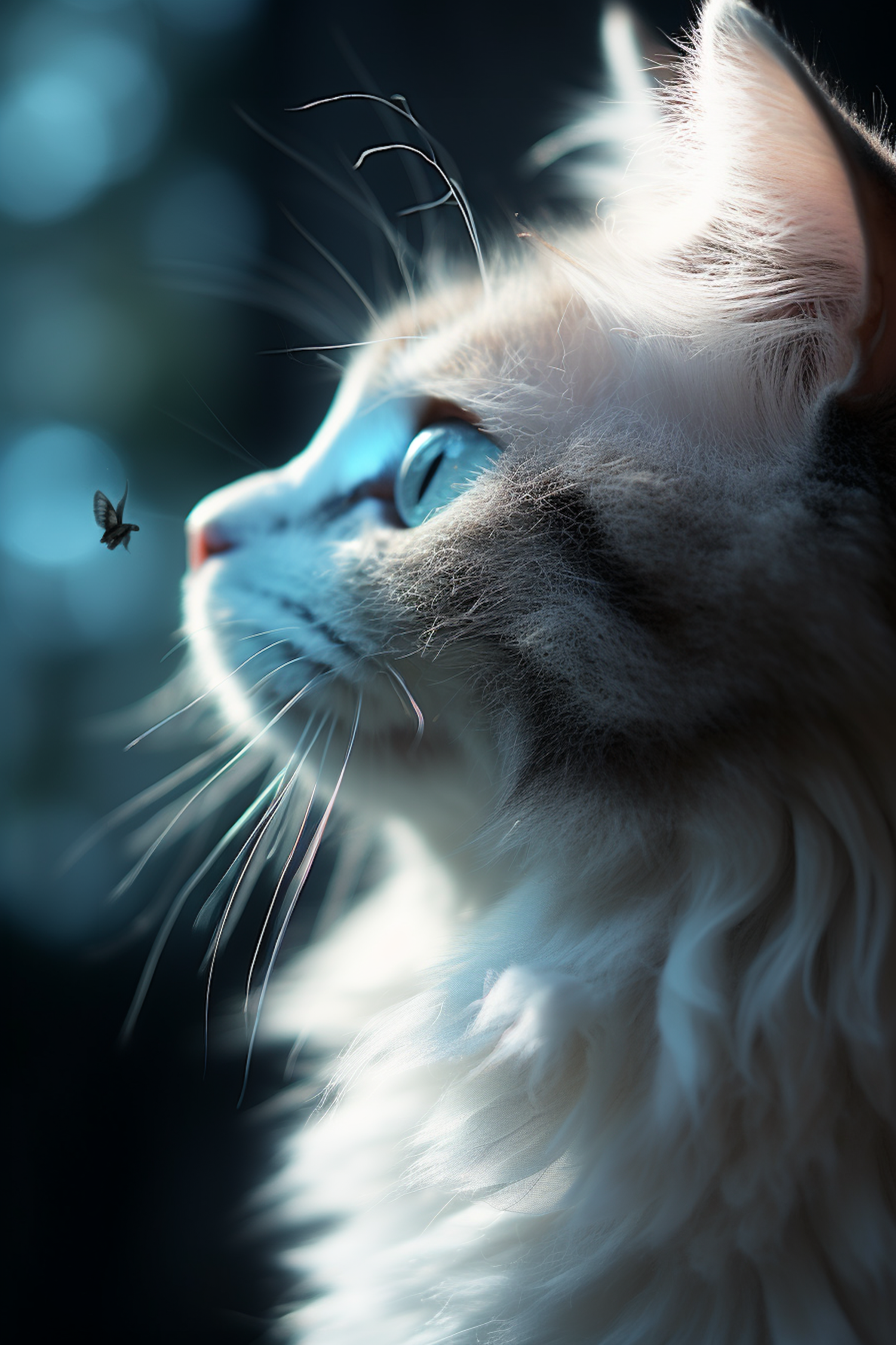 Close-up of a fluffy cat with blue eyes intently watching a fly, with soft lighting and a blurred background.