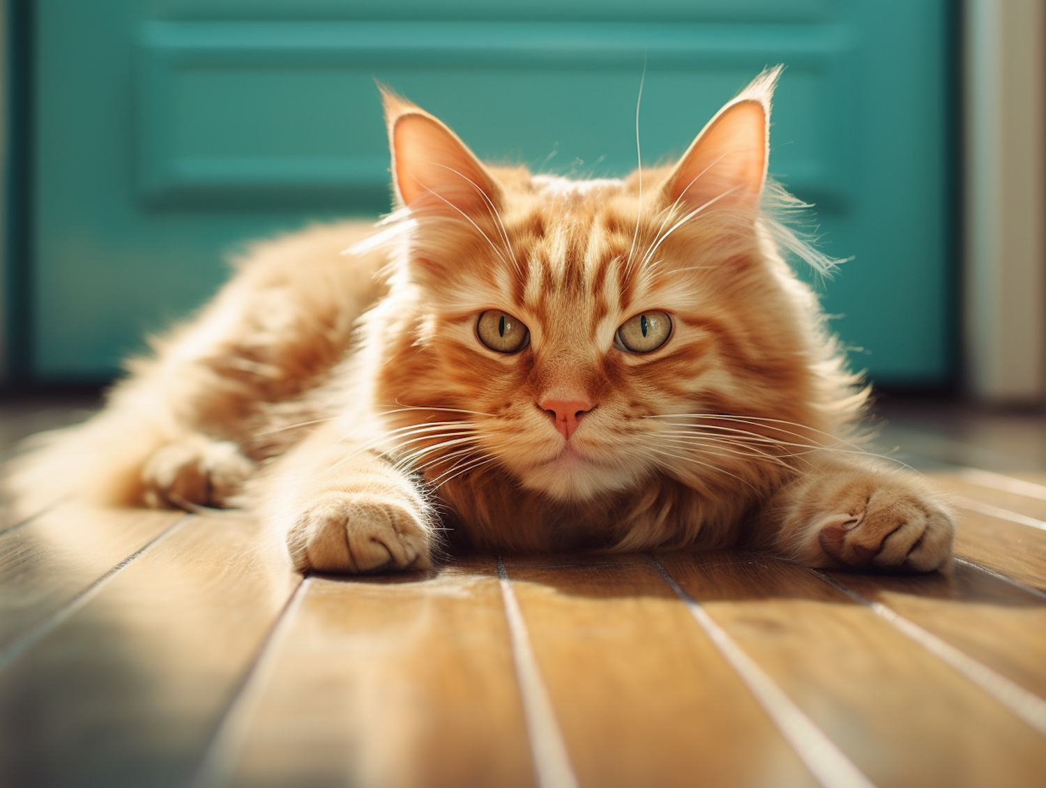 Fluffy orange tabby cat with green eyes lounging on a sunlit wooden floor, teal door in background.