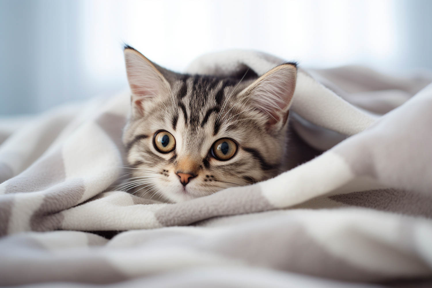 Adorable kitten with big eyes peeking from a cozy gray blanket, creating a warm and inviting scene.