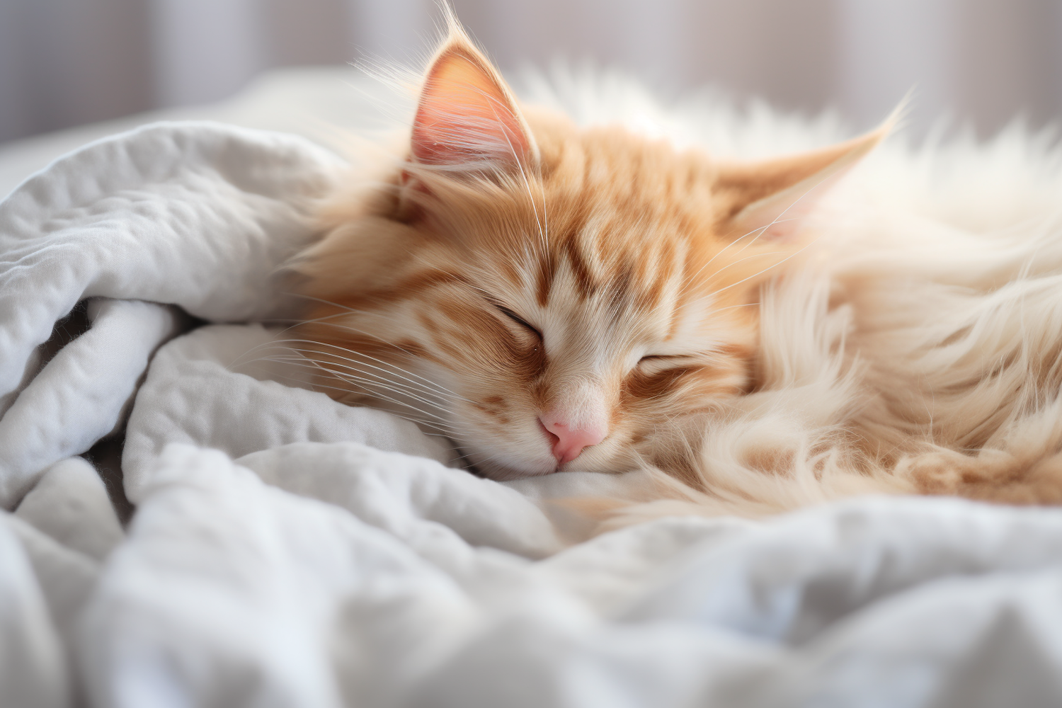 Fluffy orange and white cat sleeping peacefully in soft white bedding, creating a cozy and serene atmosphere.