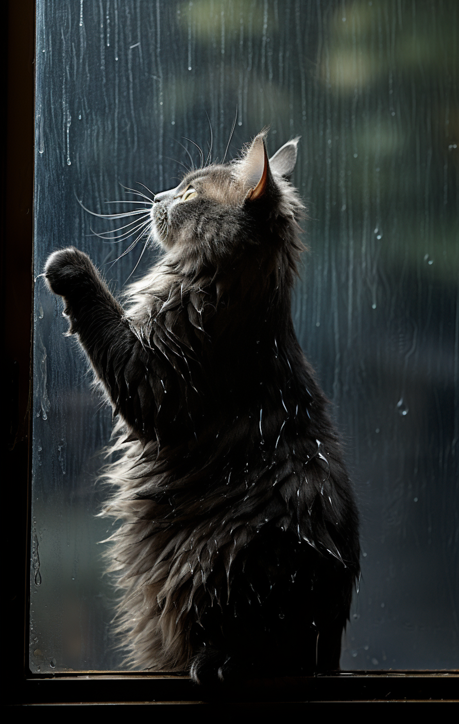 Fluffy gray cat gazes through a rain-speckled window, its fur slightly damp and eyes curious. Soft lighting highlights the serene scene.