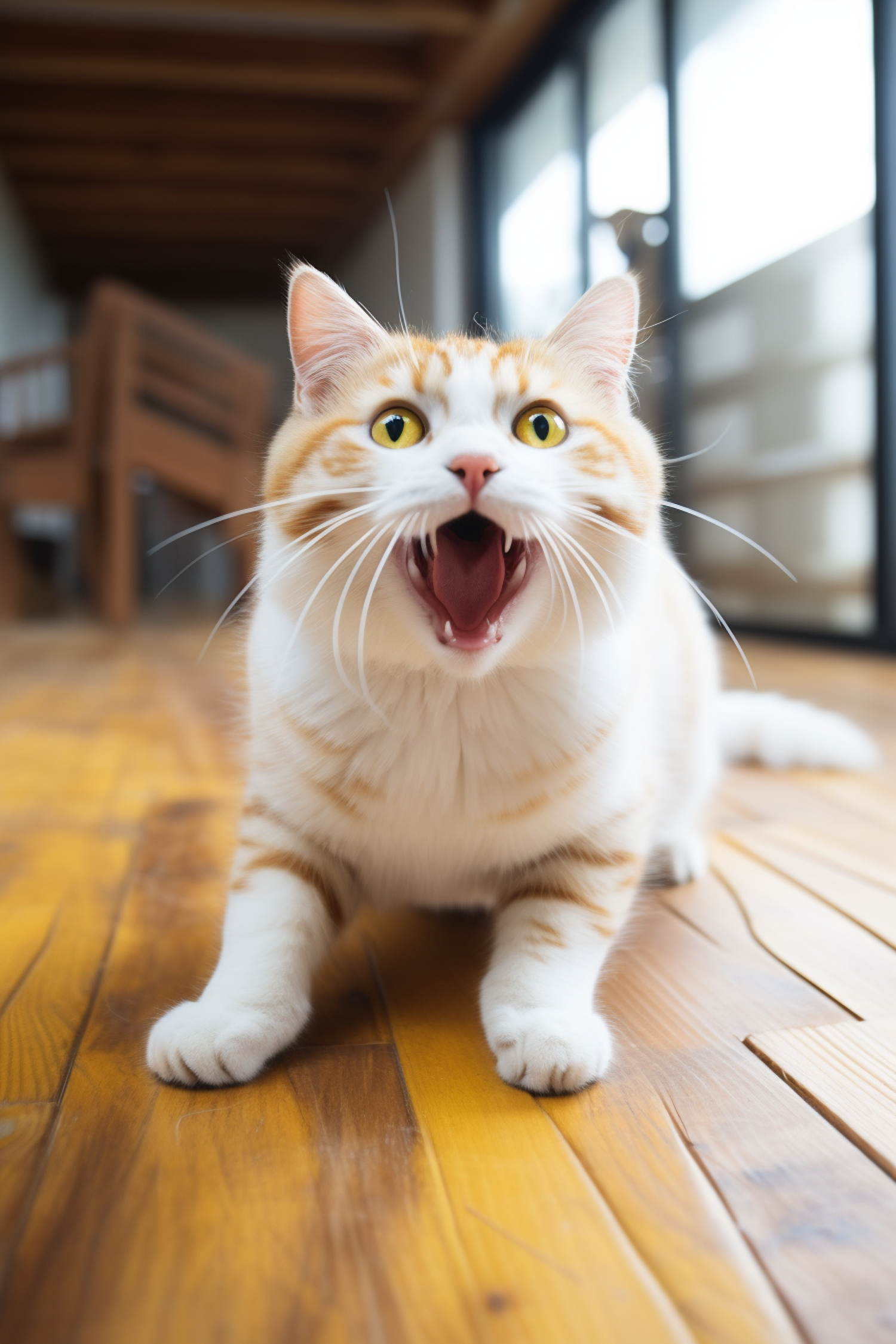 Playful orange and white cat with wide yellow eyes and open mouth on a wooden floor, ready to pounce. Bright, lively scene.
