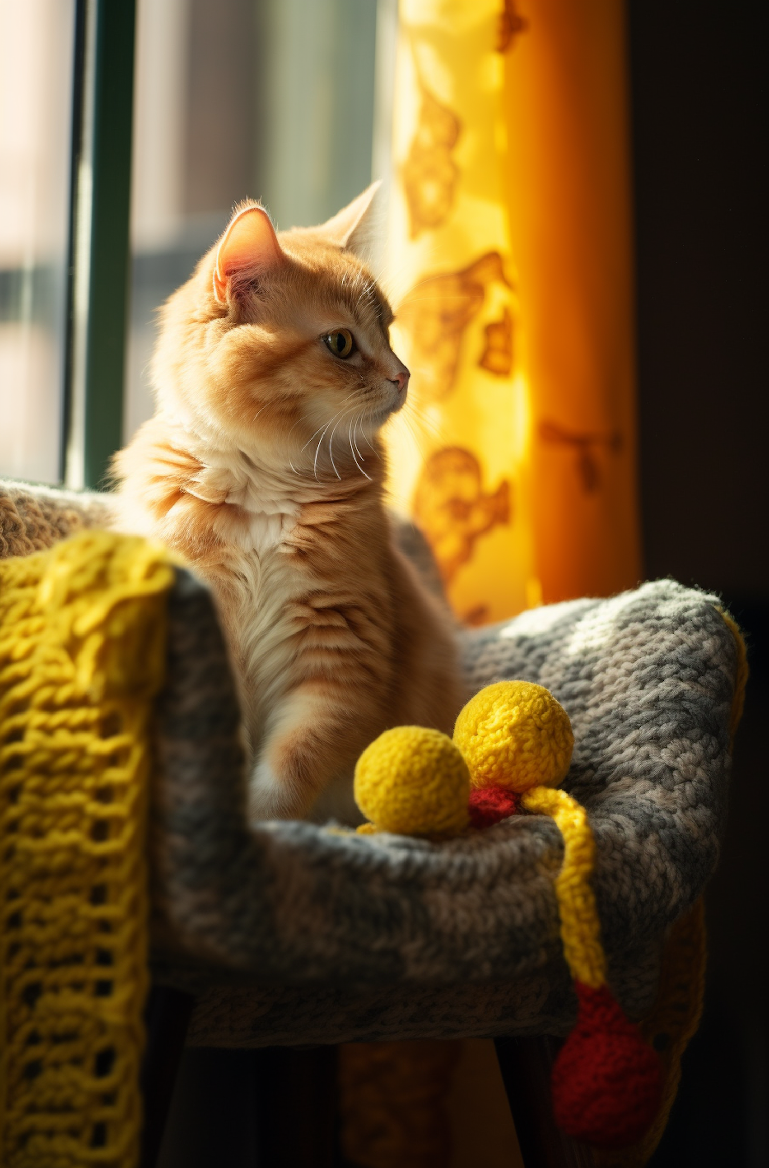 Fluffy orange tabby cat on a gray blanket, gazing out a sunlit window with a yellow knitted toy nearby.
