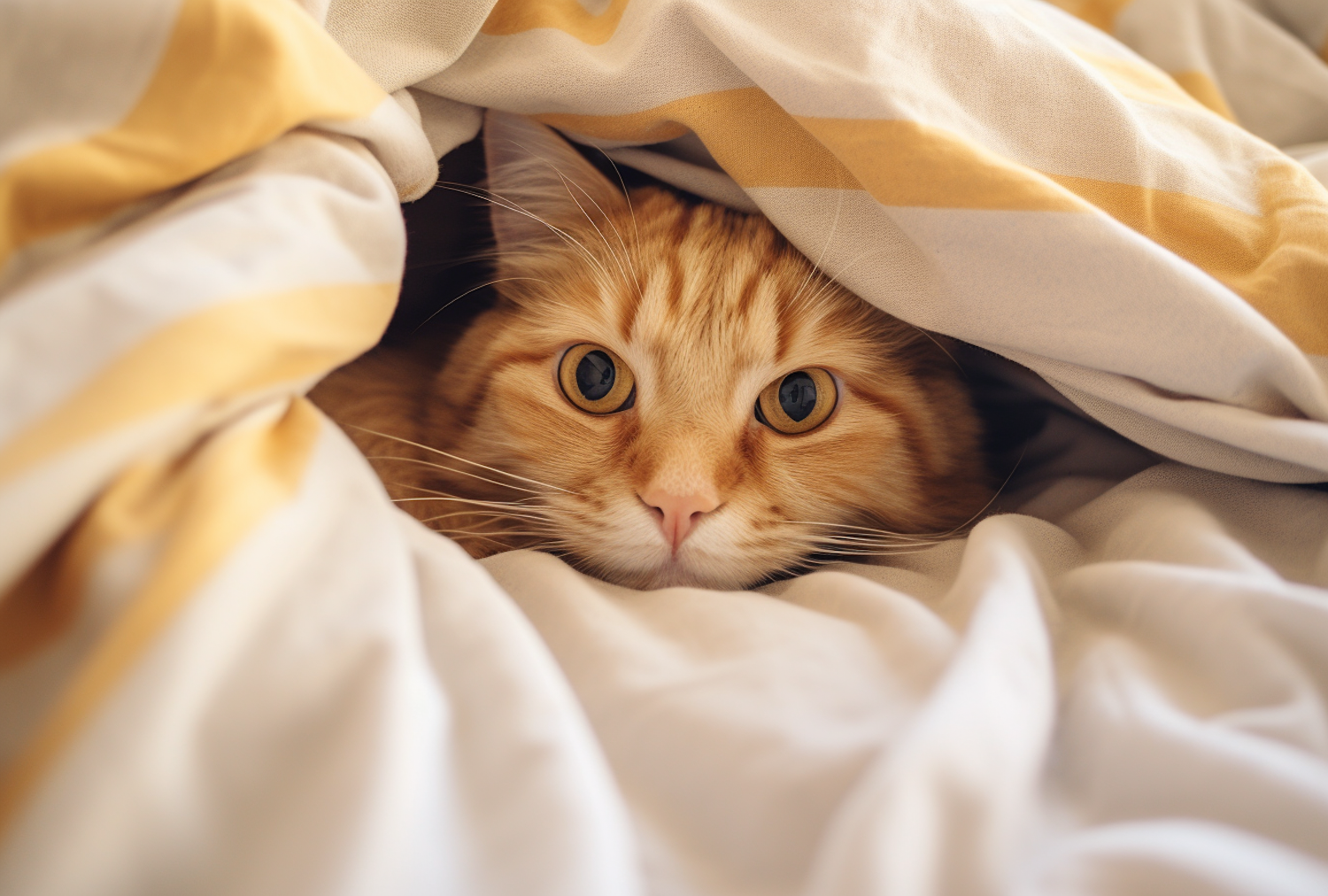 Adorable orange tabby cat peeking from under a cozy striped blanket, showcasing its fluffy fur and curious amber eyes.