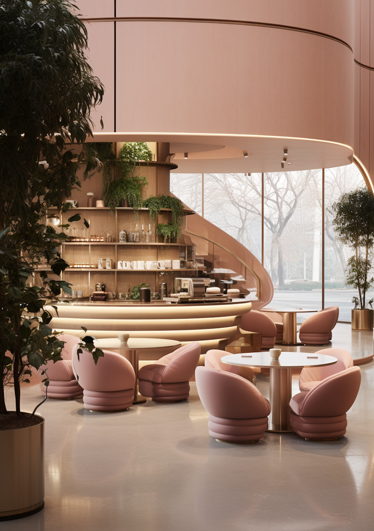 Modern café with pink chairs, lush greenery, and a curved bar design. Floor-to-ceiling windows create a bright, serene ambiance.