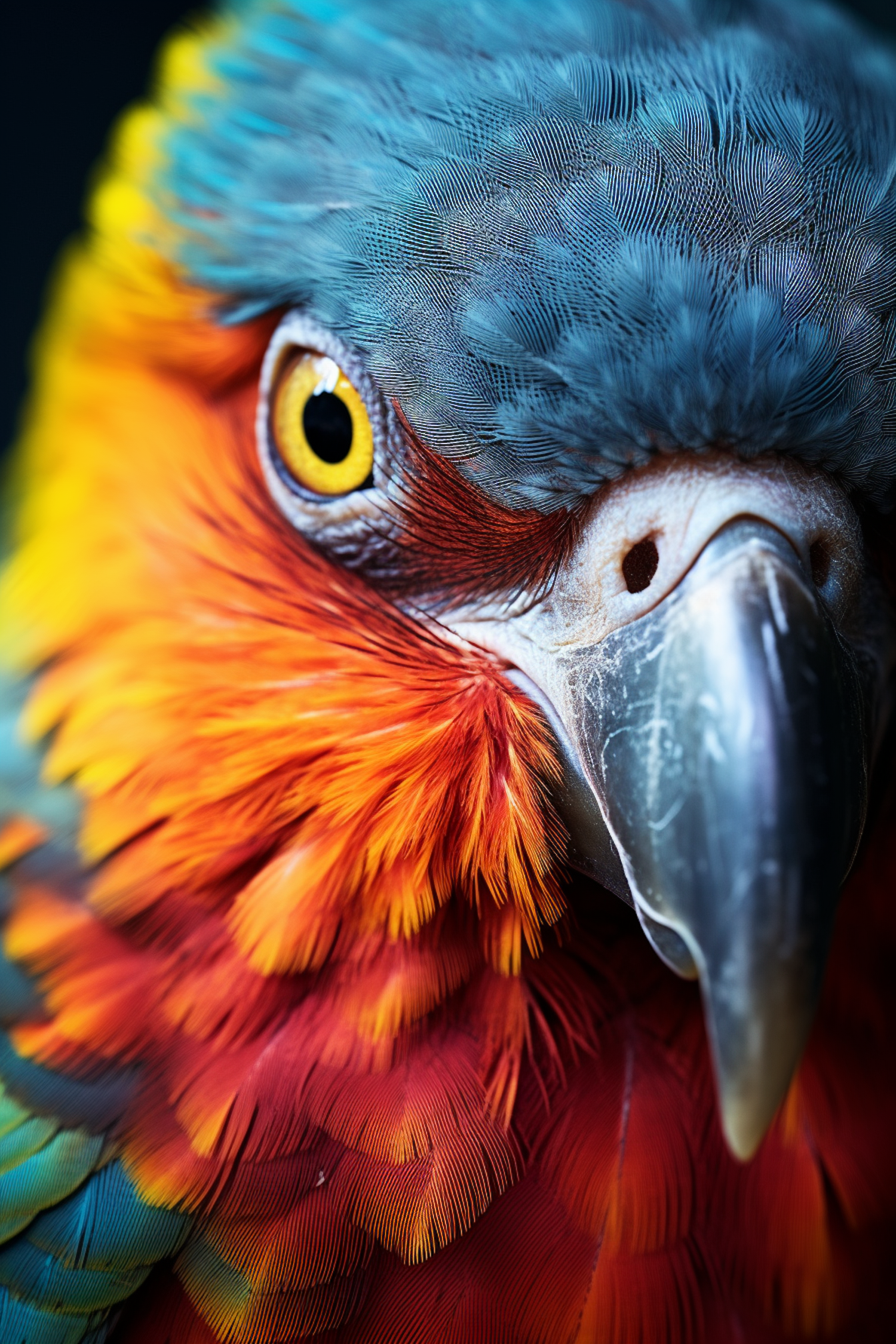 Close-up of a colorful parrot with vibrant blue, orange, and red feathers, showcasing its striking yellow eye and detailed plumage.