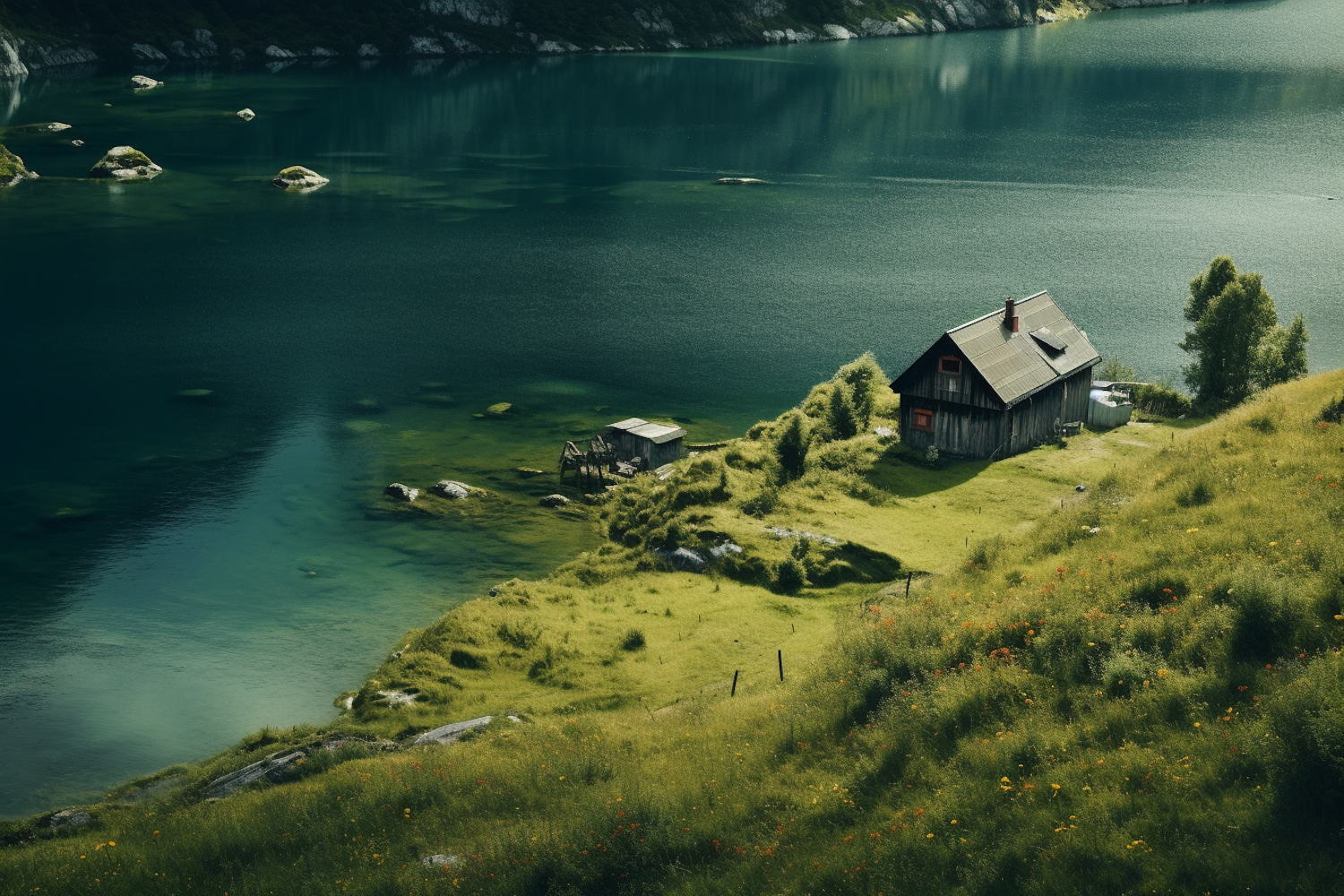 Rustic cabin on a lush hillside by a tranquil blue lake, surrounded by greenery and wildflowers, under a clear sky.
