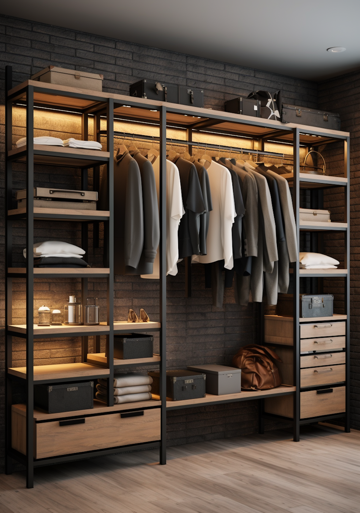 Modern open wardrobe with neutral-toned clothes, shelves, and warm lighting against a dark brick wall, creating a sleek, organized look.