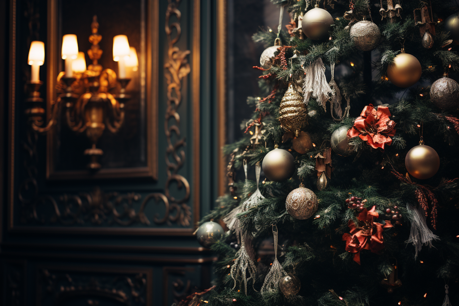 Luxurious Christmas tree with golden and red ornaments, set against an ornate wall with a classic sconce. Festive and elegant.