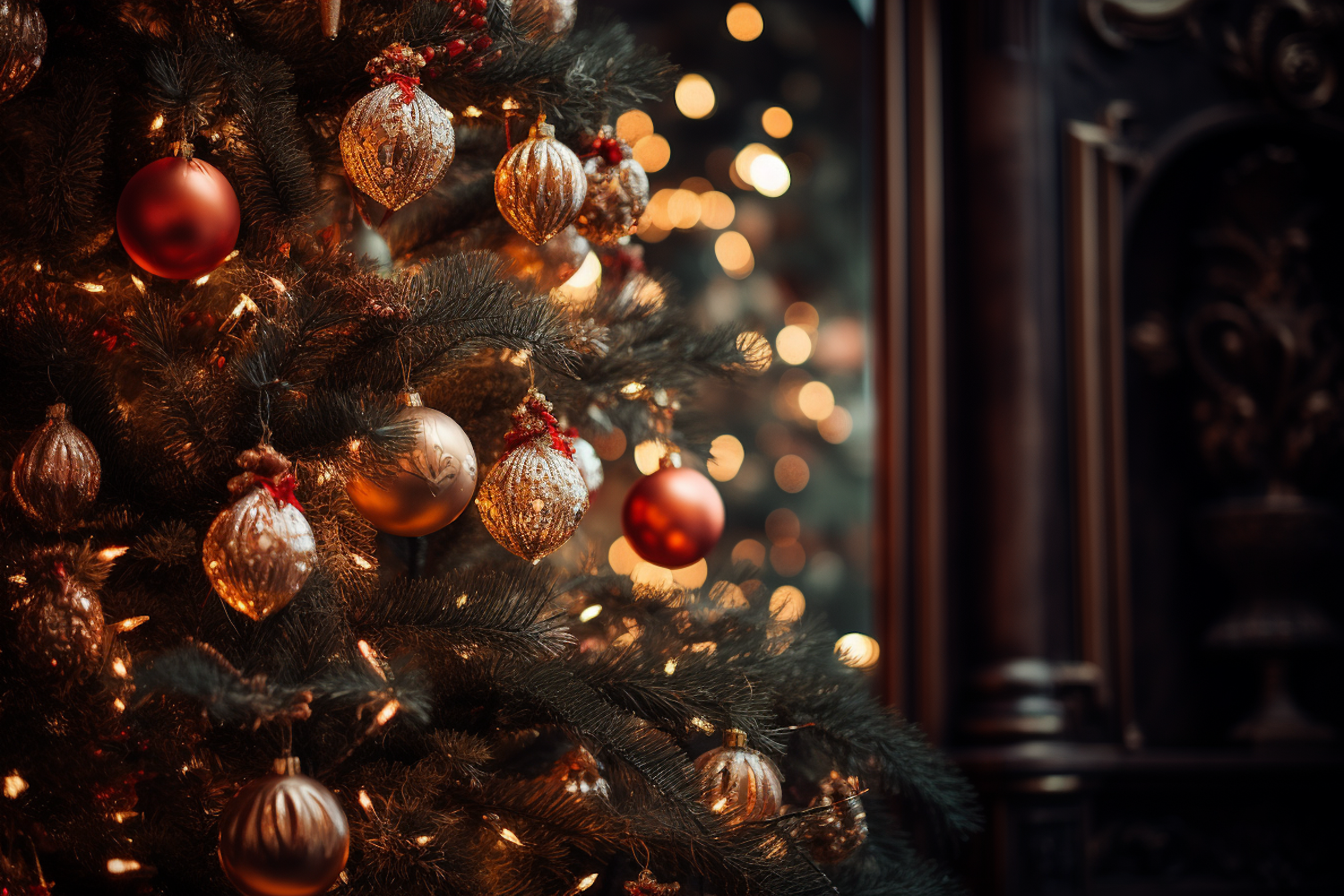Elegant Christmas tree with gold and red ornaments, glowing lights, and a festive ambiance. Perfect for holiday inspiration.