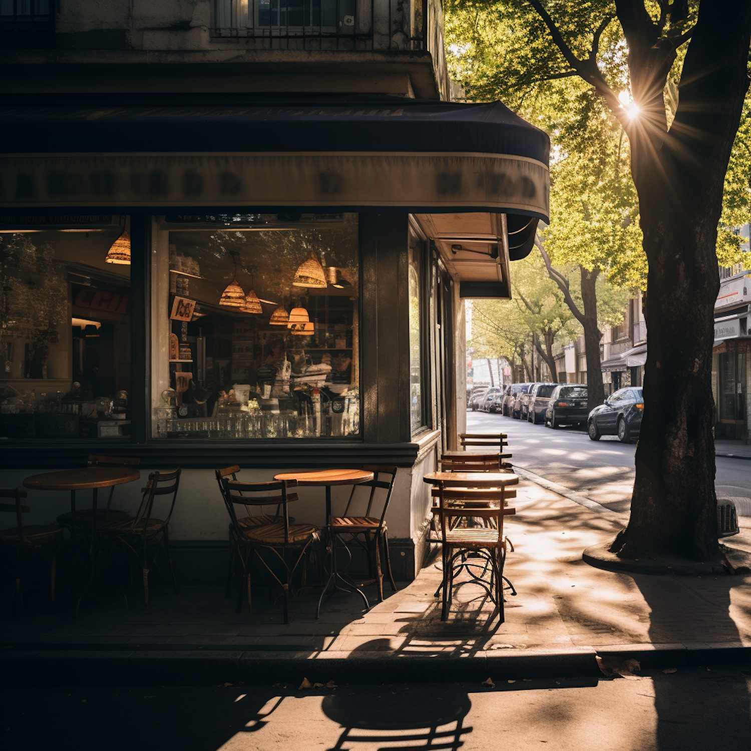Charming street-side café with warm sunlight, wooden tables, and a cozy interior. Perfect for a peaceful urban afternoon.