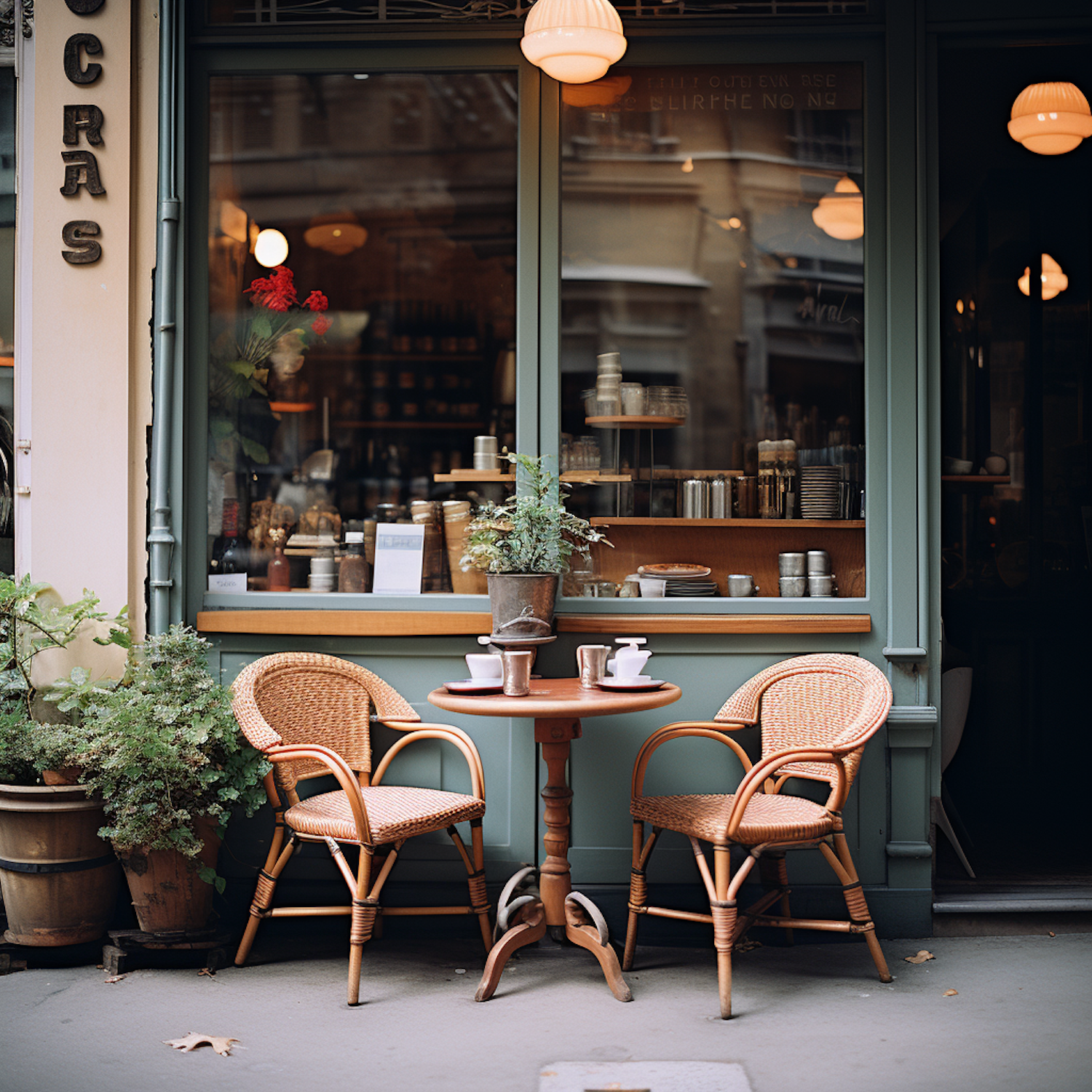 Charming outdoor café with wicker chairs and a wooden table, set against a cozy green-painted exterior with warm lighting.