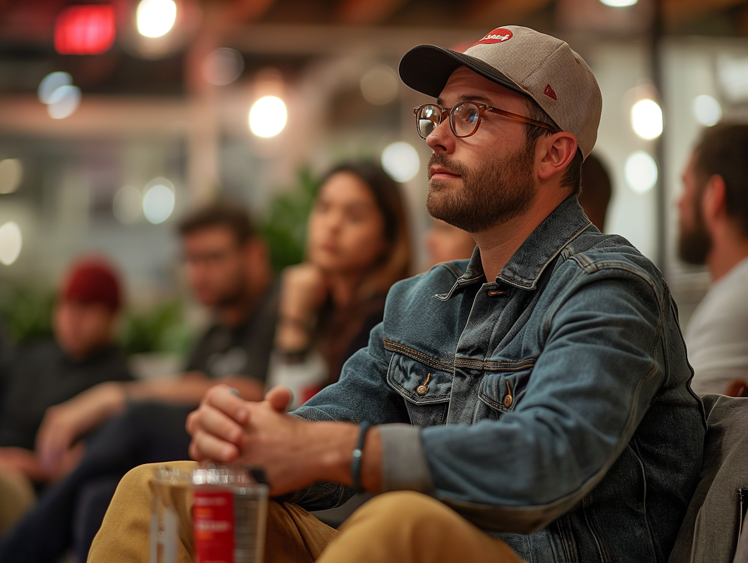 Man in denim jacket and cap attentively listens in a casual group setting with warm lighting.