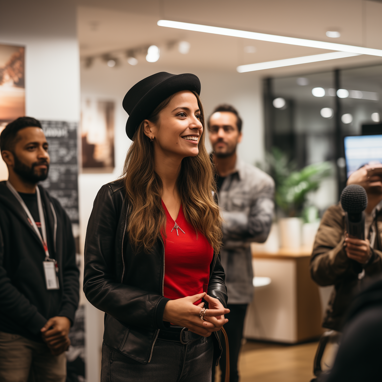 Young woman in a black hat and leather jacket smiling in a modern setting, surrounded by people, possibly during an interview.