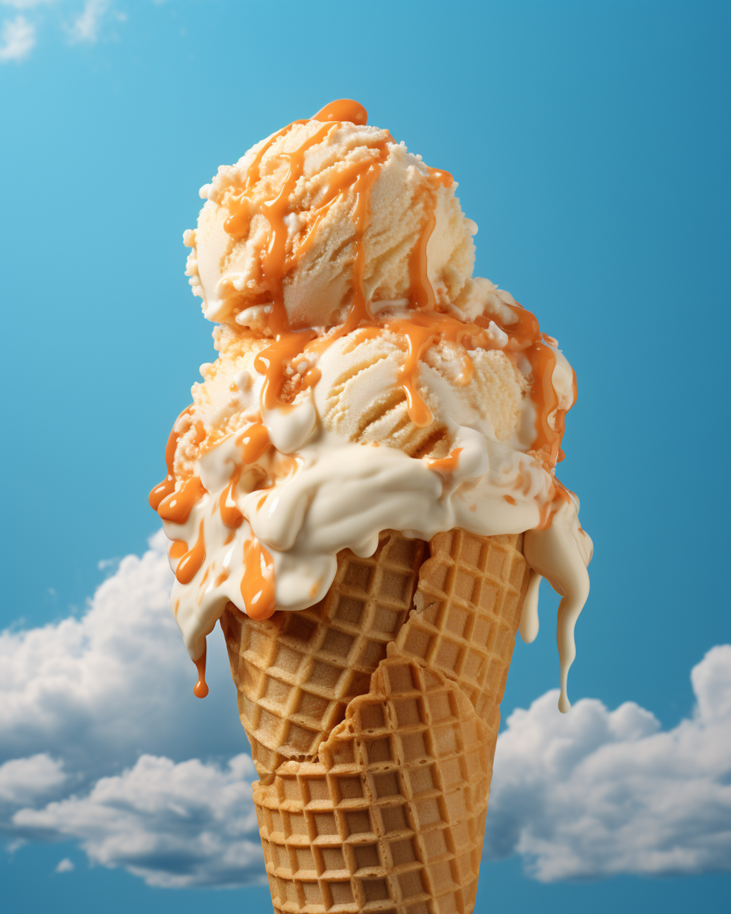 Vanilla ice cream cone with caramel drizzle against a bright blue sky and fluffy clouds, capturing a perfect summer treat moment.