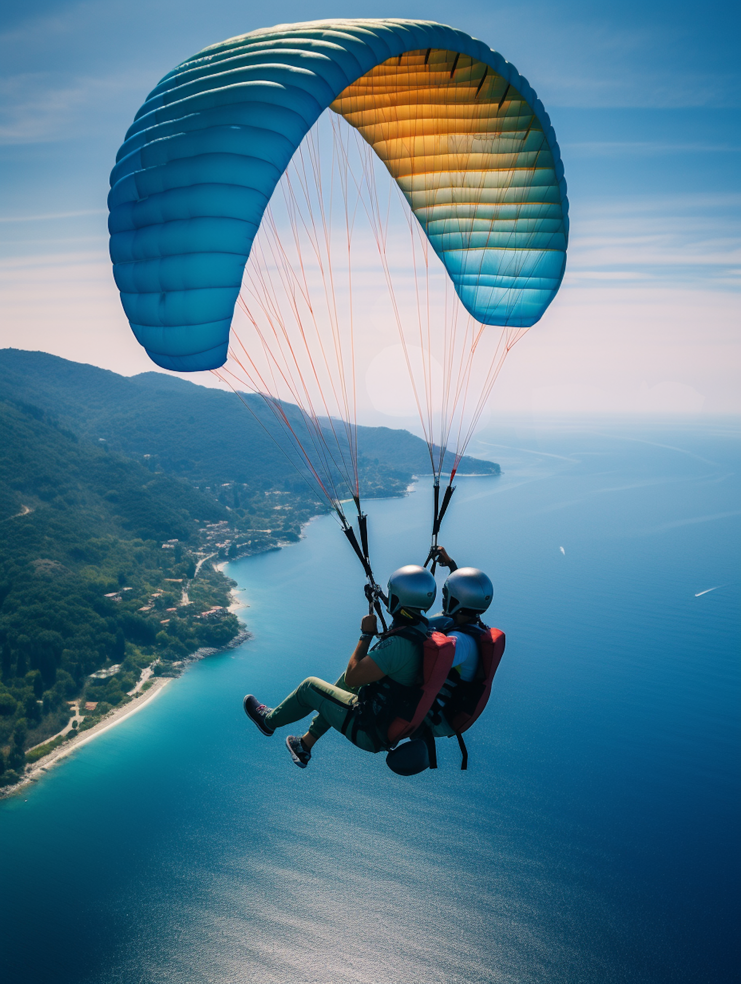 Two people paragliding over a scenic coastal landscape with a colorful parachute, enjoying the thrill of flight above the ocean.