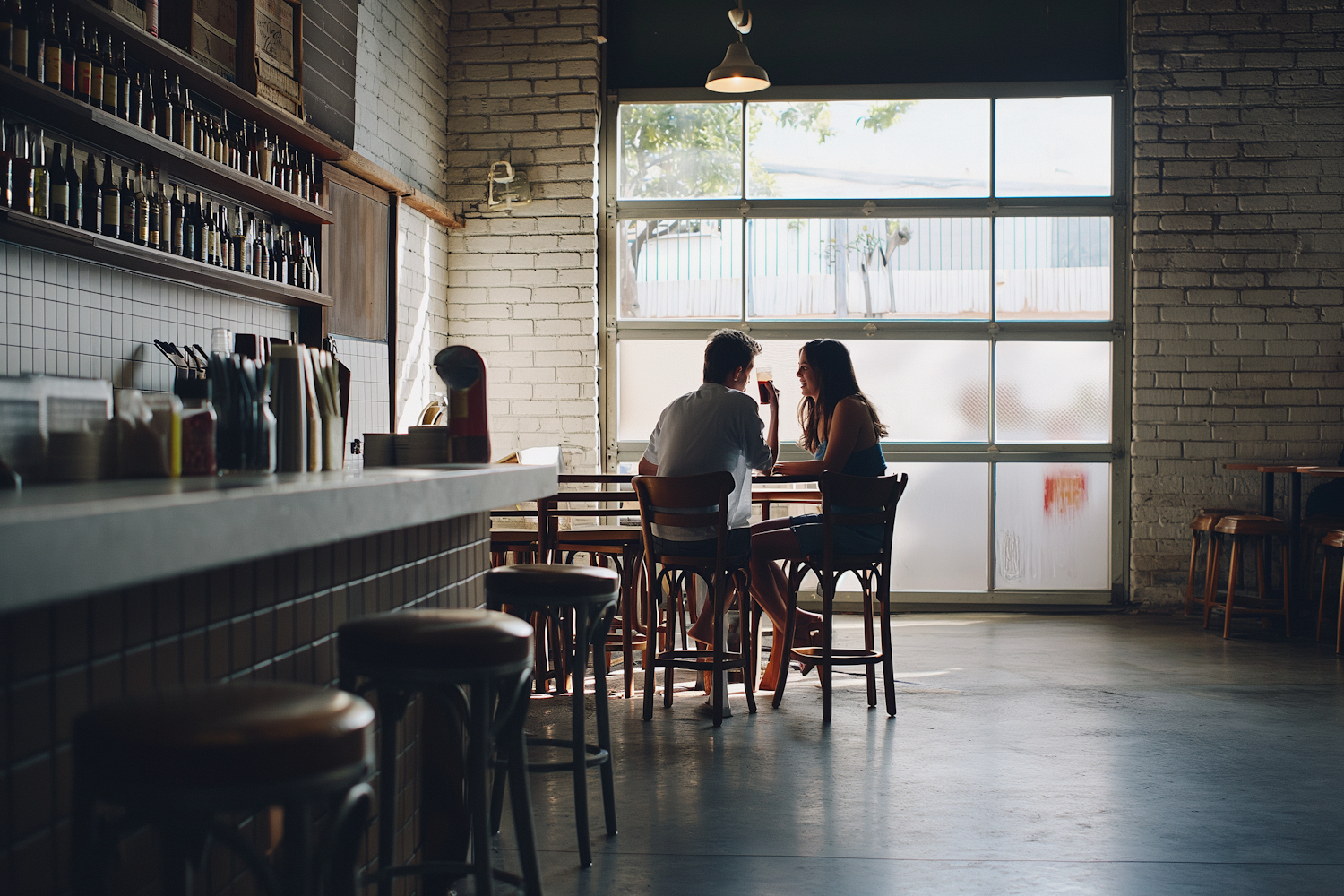 A couple enjoys a cozy conversation in a sunlit cafe, surrounded by white brick walls and a warm, inviting atmosphere.