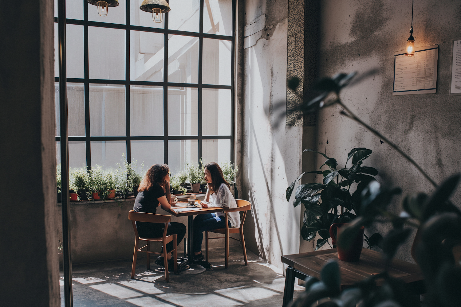 Two women enjoy coffee and conversation in a sunlit cafe with rustic decor and lush greenery.