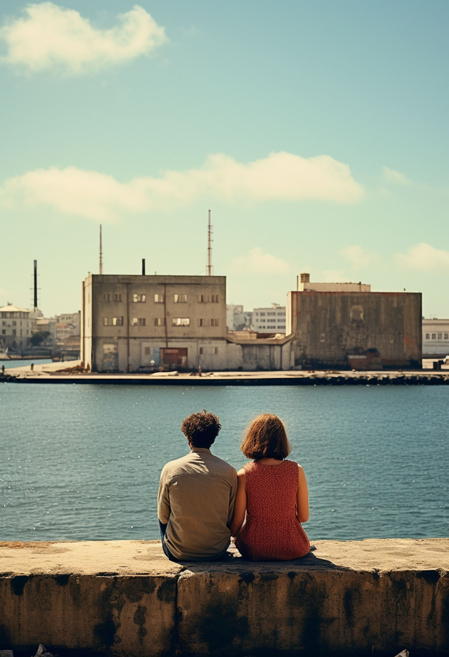 A couple sits by the water, facing an industrial building under a clear sky, creating a serene and intimate scene.
