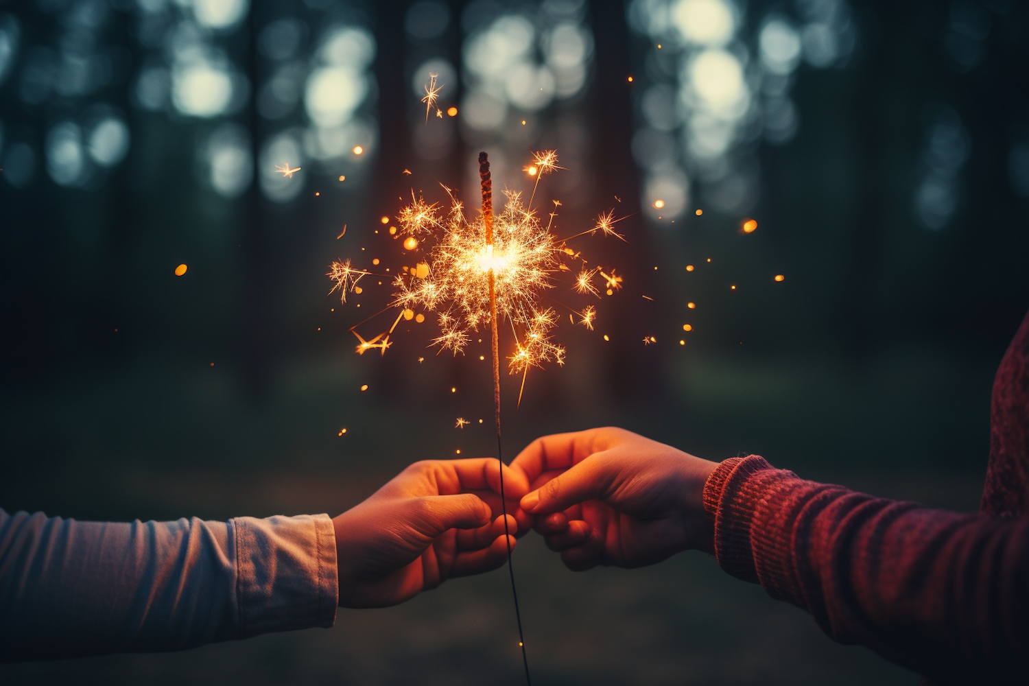 Two hands holding a lit sparkler in a dark forest, creating a warm and festive atmosphere with bright, golden sparks.