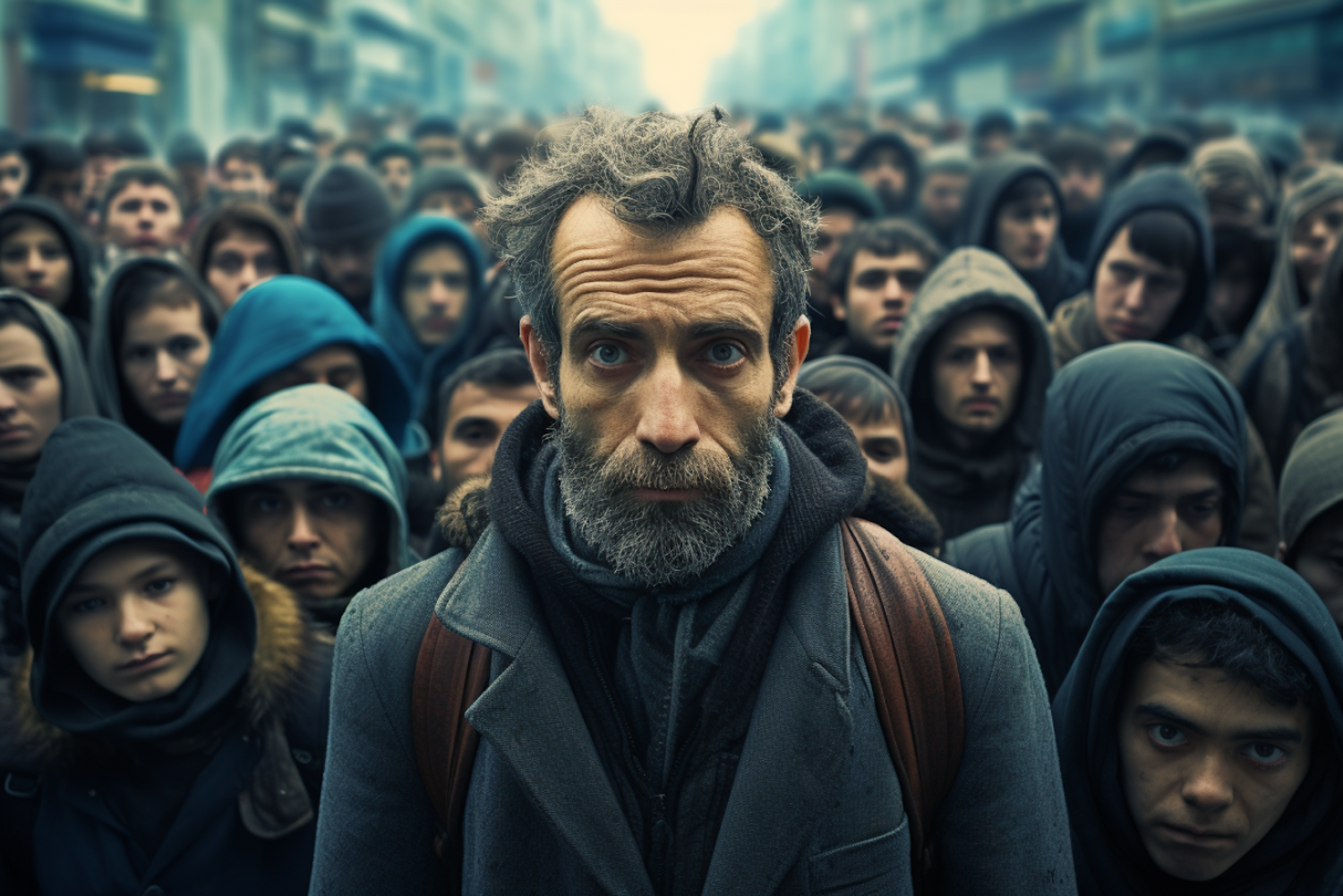 A rugged man with a beard stands in a crowded urban street, surrounded by somber individuals in hooded jackets.